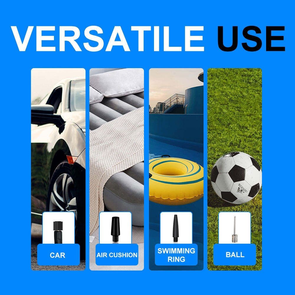 Intelligent Inflation System: Features a digital display and 3 valve options (schrader, presta, ball needle, swim ring adapter) for versatility. It detects current pressure, lets you set desired levels, and auto-shuts off upon reaching them, guaranteeing precise, effortless inflation for multiple objects without manual monitoring.