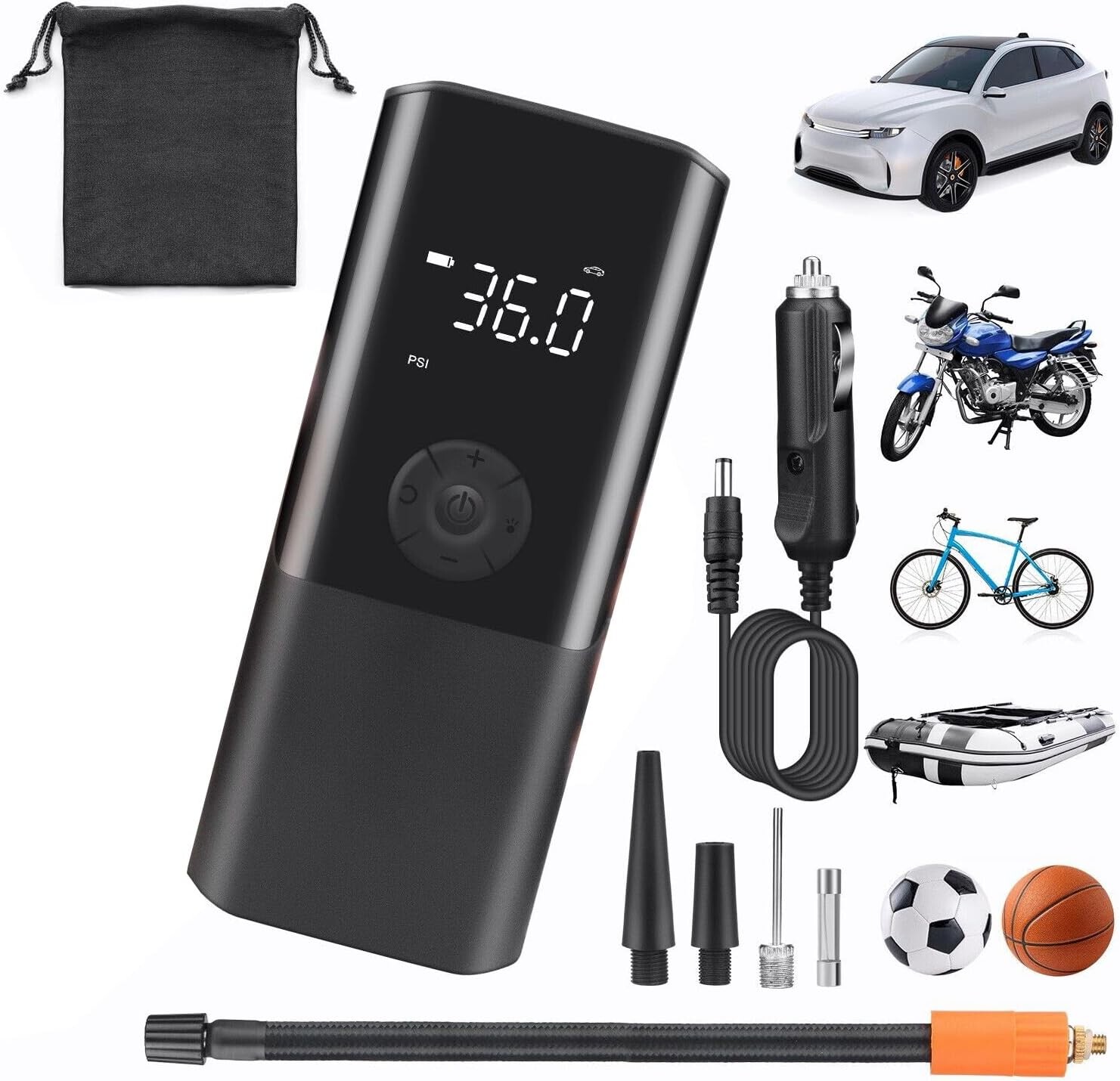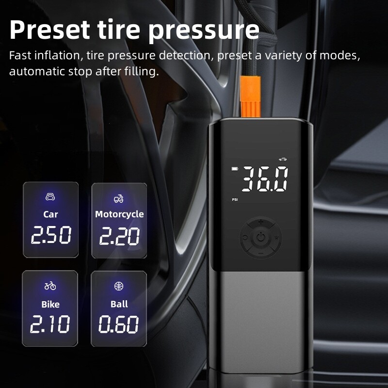 This portable tire air compressor features rapid inflation via an upgraded motor and full metal cylinder, filling a flat tire in ~5 minutes with 160PSI max pressure for cars, bikes, balls, etc. It has a smart system with a digital display, 3 valve options, auto-shutoff. Plus, an LED light, low noise, and compact hose storage for convenience.