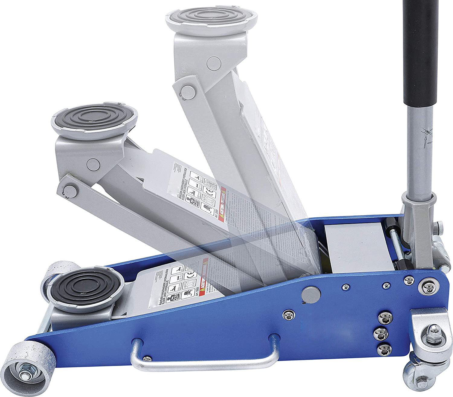 El gato hidráulico de elevación rápida de 1.5 toneladas (modelo 38401107) es duradero y fácil de usar, ideal para elevar automóviles y furgonetas ligeras con una altura de asiento de 90 a 358 mm. Cuenta con ruedas robustas para mayor estabilidad y una bomba doble para una elevación rápida, ideal para talleres y cambio de neumáticos en carretera.