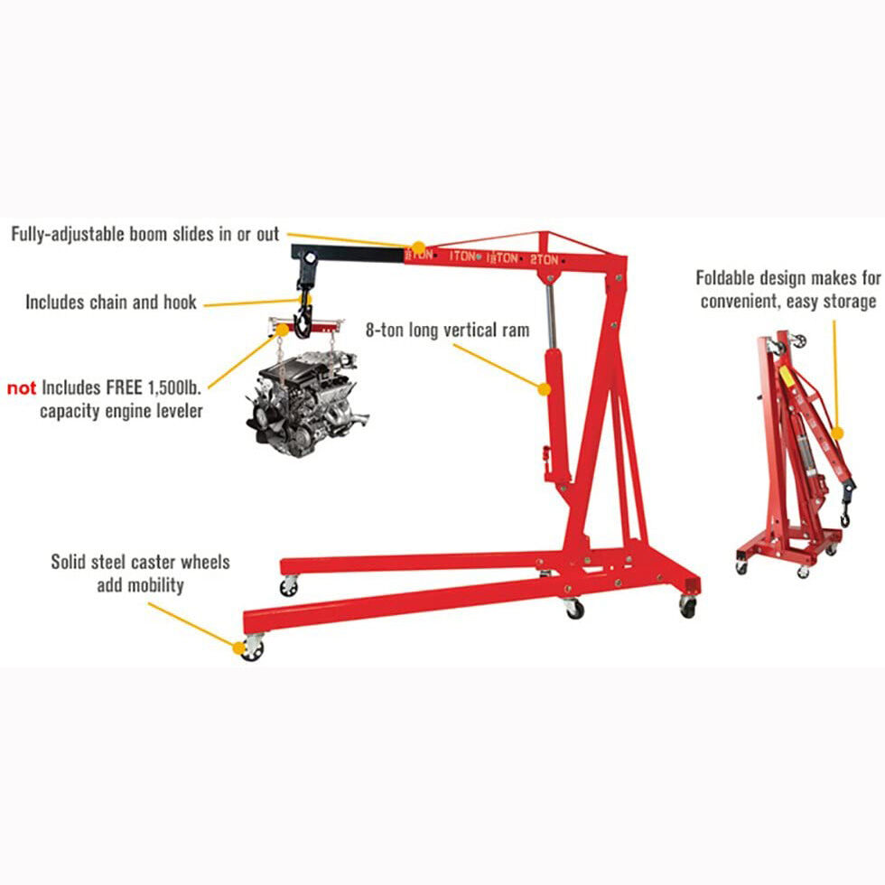Pluma ajustable: El polipasto nivelador de motor ofrece una pluma totalmente ajustable de 3 posiciones para adaptarse a sus necesidades de elevación. La pluma de la grúa se ajusta fácilmente para izar el motor.
