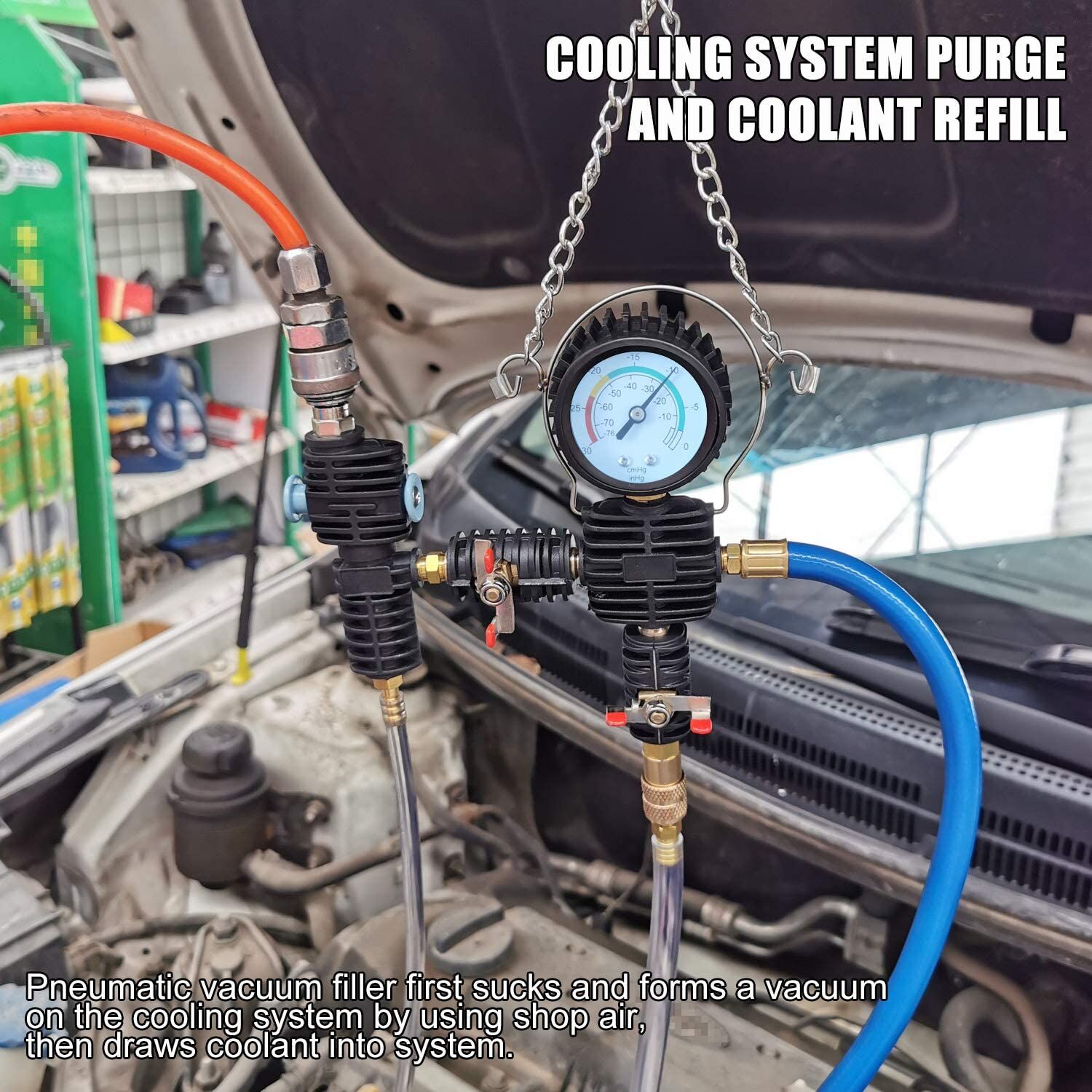 Kit de herramientas para coche: El comprobador de presión del radiador está diseñado para detectar fugas en el sistema de refrigeración y rellenar y sustituir rápidamente el refrigerante.