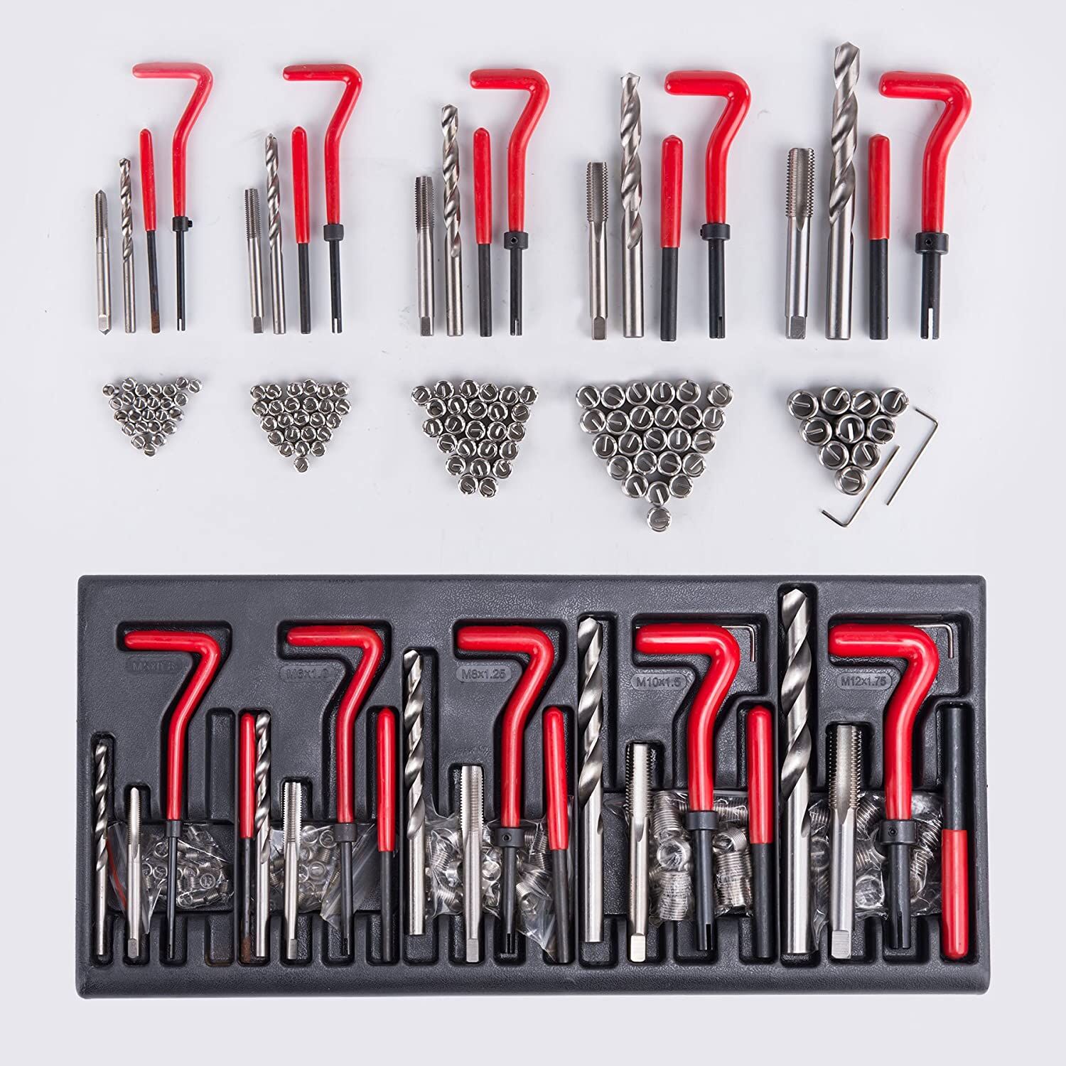 Amplia gama de tamaños: Esta herramienta de reparación de roscas de 131 piezas es apta para M5, M6, M8, M10 y M12. Crea una rosca interna más resistente en metales blandos y protege las roscas roscadas del desgaste y los daños.