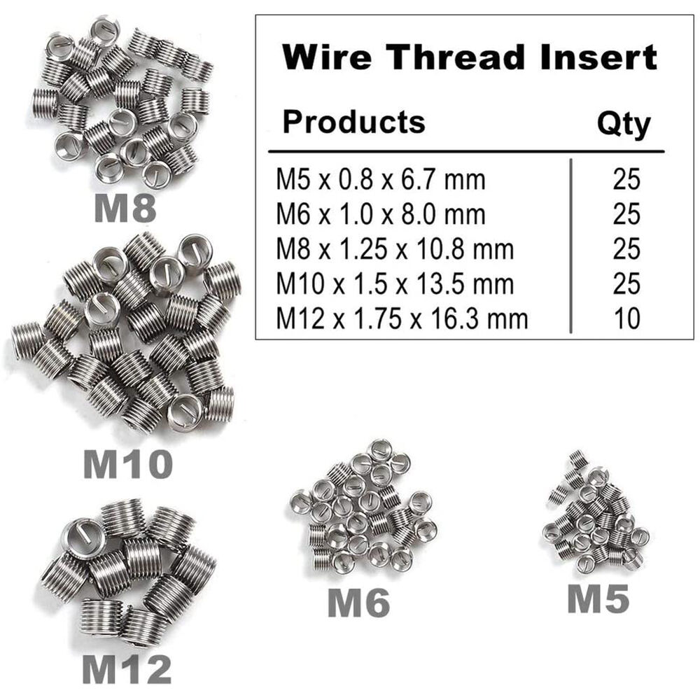 | Package Include: | 5 Installation Tools 5 Break Pin Tools 5 Twist Drills 1 Hex Key 5 Taps 110 WireThread Inserts: M5 x0.8x 6.7mm M6 x1.0x 10.8mm M8 x1.25x 10.8mm M10 x1.5x 13.5mm M12 x1.75x 16.3mm |