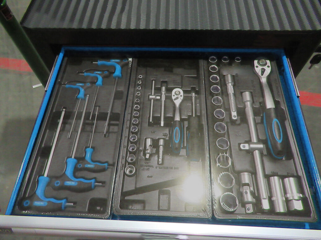 Four Wheels for Mobility: The cabinet is mounted on wheels, allowing for easy movement around the workspace. It includes a side handle for pushing and pulling, with the ability to lock two wheels for stability.