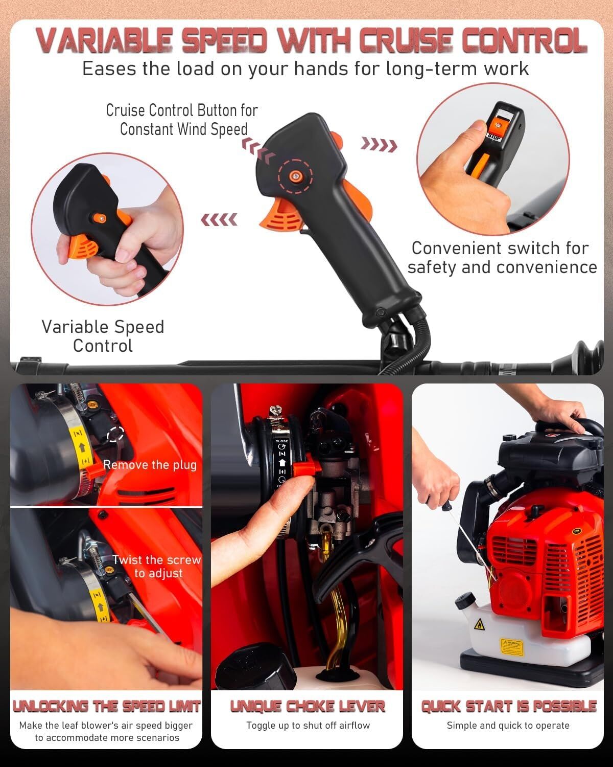 Versatile and Fatigue-Free Operation:Featuring a professional-grade speed control system, it seamlessly adapts from delicate garden care requiring precise airflow to high-powered debris removal for heavy-duty jobs. The advanced cruise control function maintains consistent airflow throughout cleanup tasks, reducing the need for constant manual adjustment and minimizing operator fatigue, even during long work sessions.