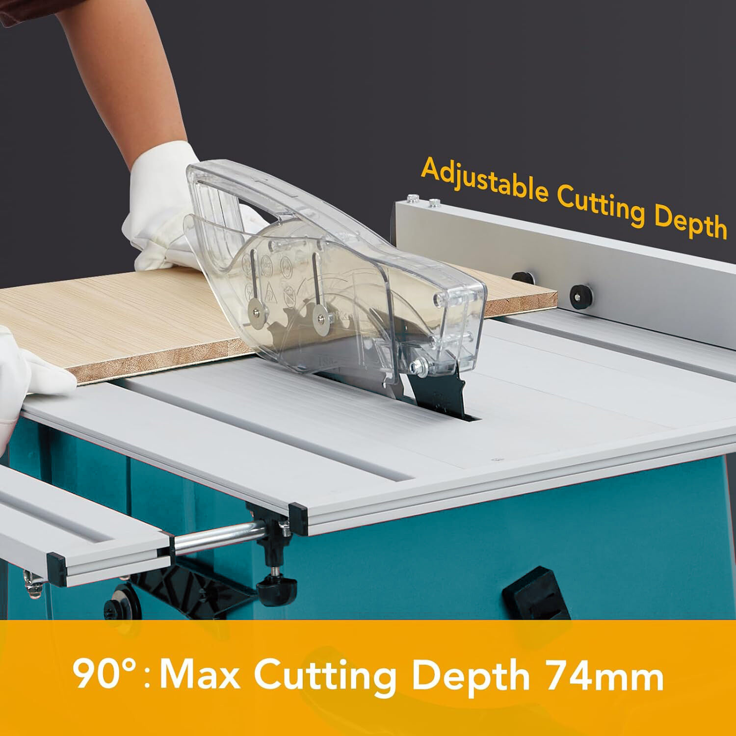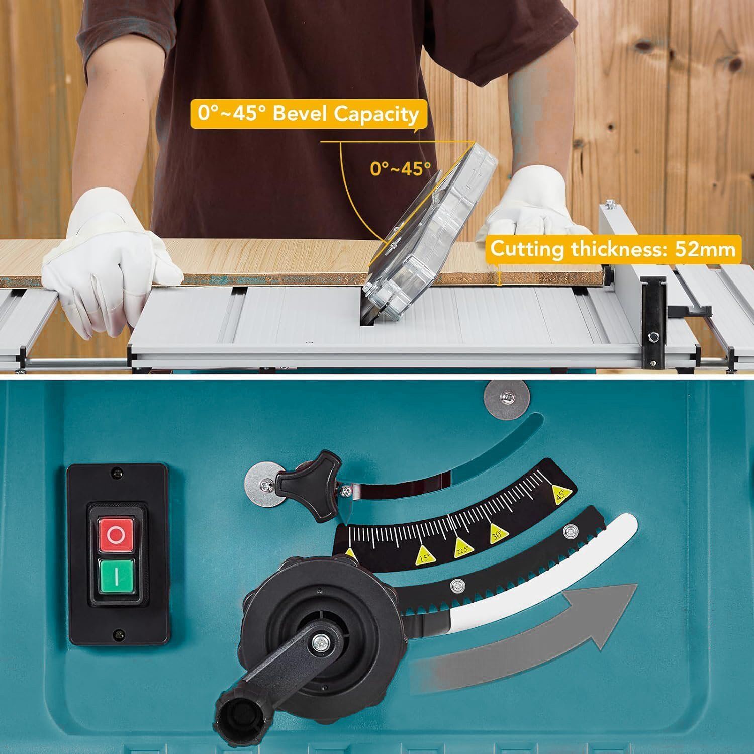 Adjustable angle:The blade height can be adjusted to meet your specific cutting needs with hand wheel. This table saw has a rack and pinion bevel control that provides 90°cross cutting and 0-45°bevel cutting.