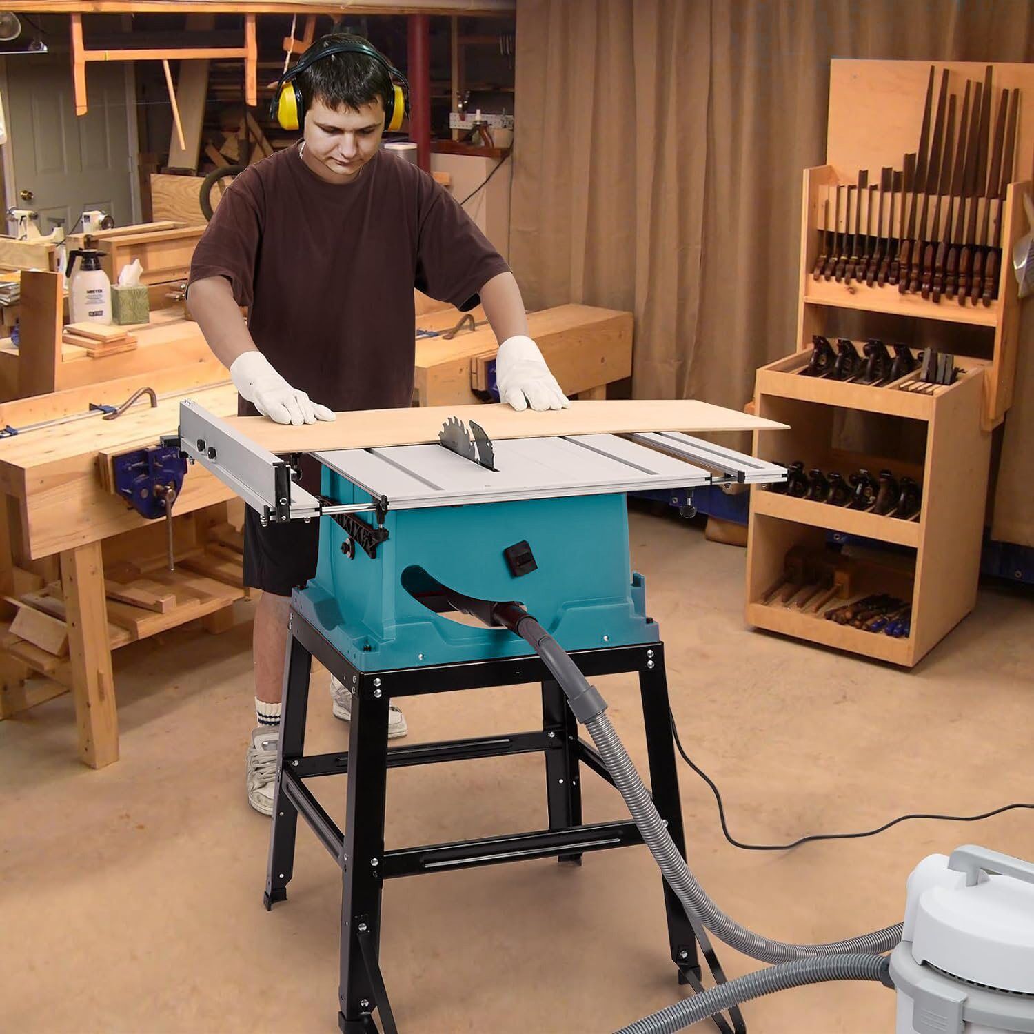 This table saw features with high-quality 2000W motor, which can achieve 4800 RPM cutting performance, easy to cut all kinds of hardwood. And triangle supports at the back of the metal stand improves the stability of the table saw. Besides, extensions on both sides of the table top also allows it to handle a larger piece of wood more stably.