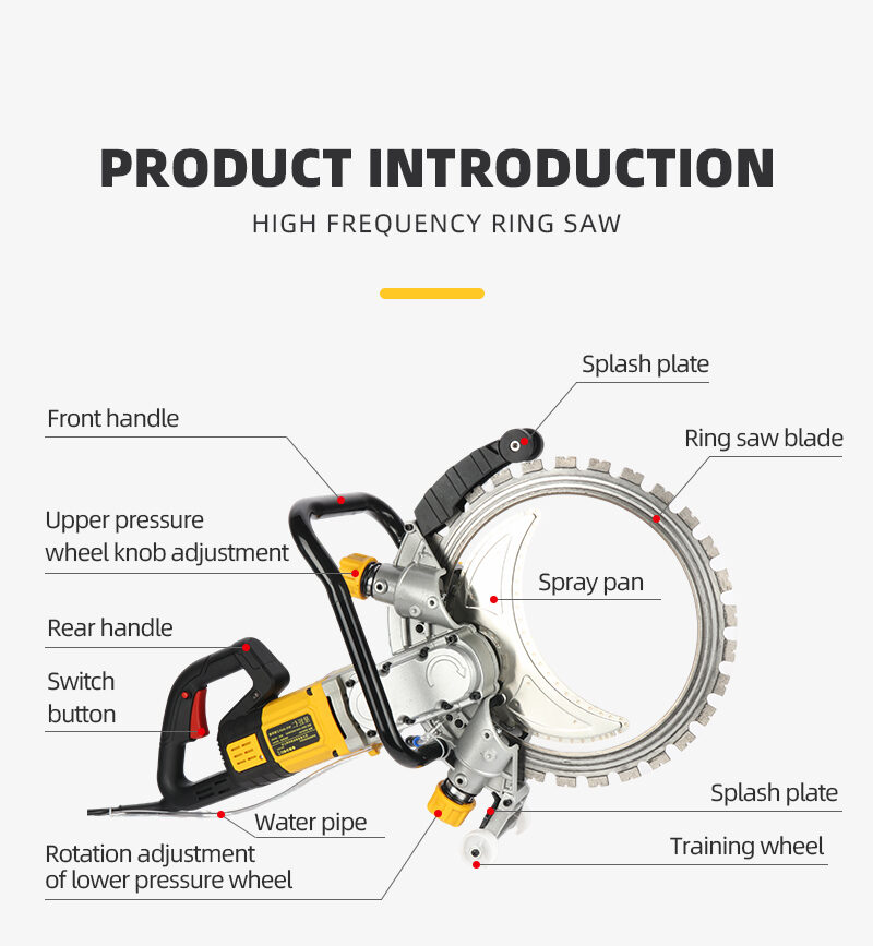 The Ring Saw Machine is a versatile construction tool. It cuts marble, reinforced concrete, brick masonry, and floors effortlessly. Suitable for wall openings like windows, doors, staircases, and elevators, it features high efficiency with a powerful motor for quick cutting. Durable, it withstands harsh sites, delivering strong force for tough materials, ideal for diverse construction and renovation needs.