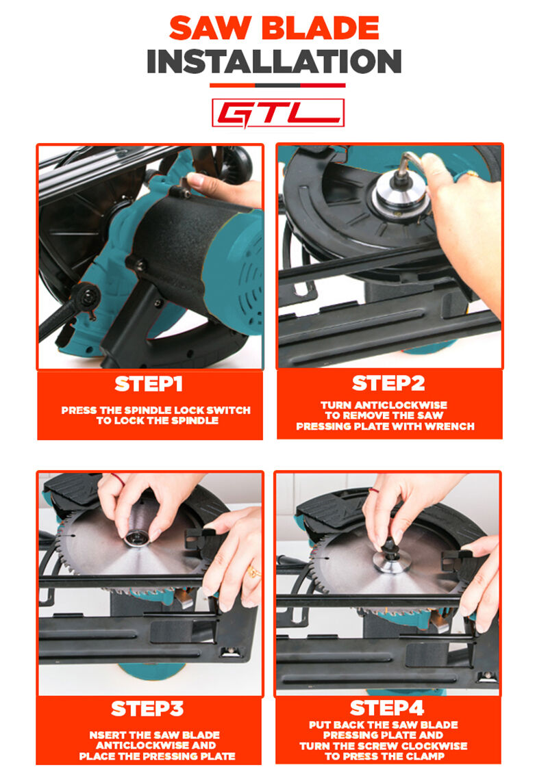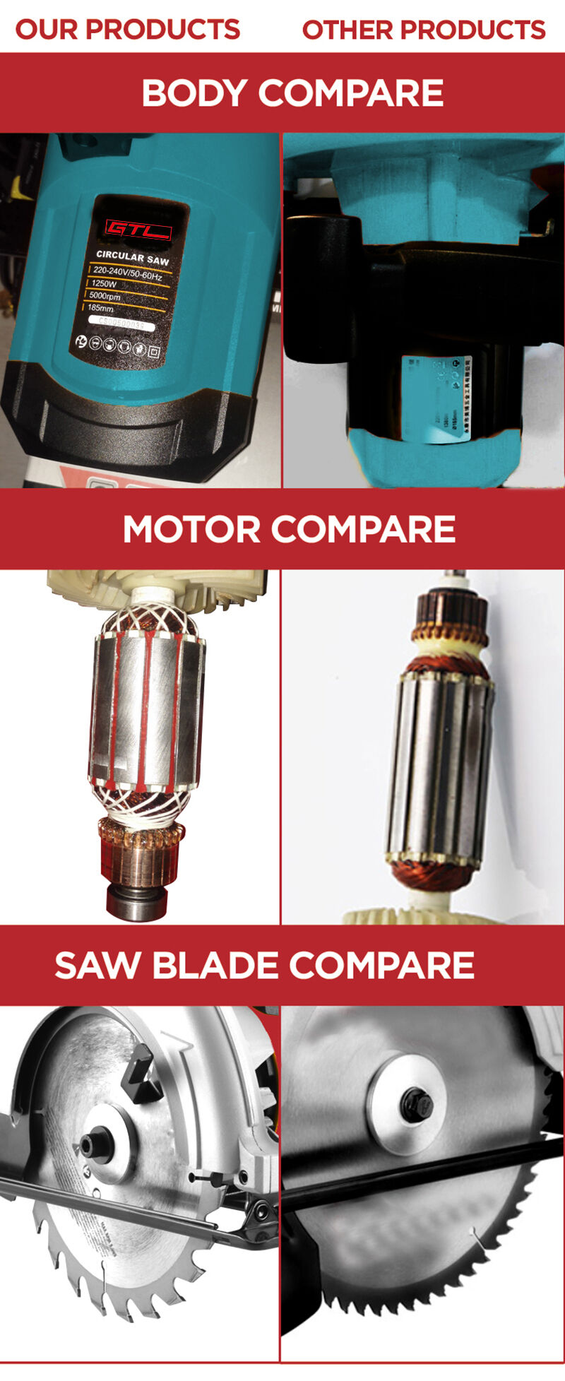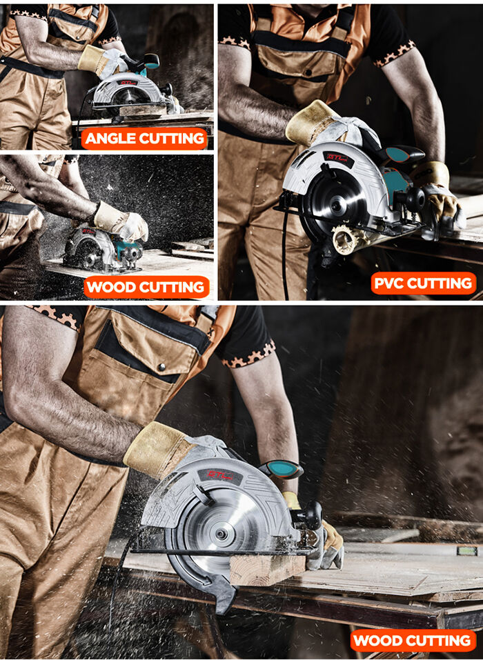 Motor eficiente y potente: 1200W~1500W. Con un potente motor de cobre puro, esta sierra circular ofrece un rendimiento óptimo a 4500 rpm para cortar azulejos, madera, paneles metálicos, plásticos y suelos en una sola pasada con una hoja precisa. Su robusta protección inferior evita lesiones por chispas o virutas durante el funcionamiento.