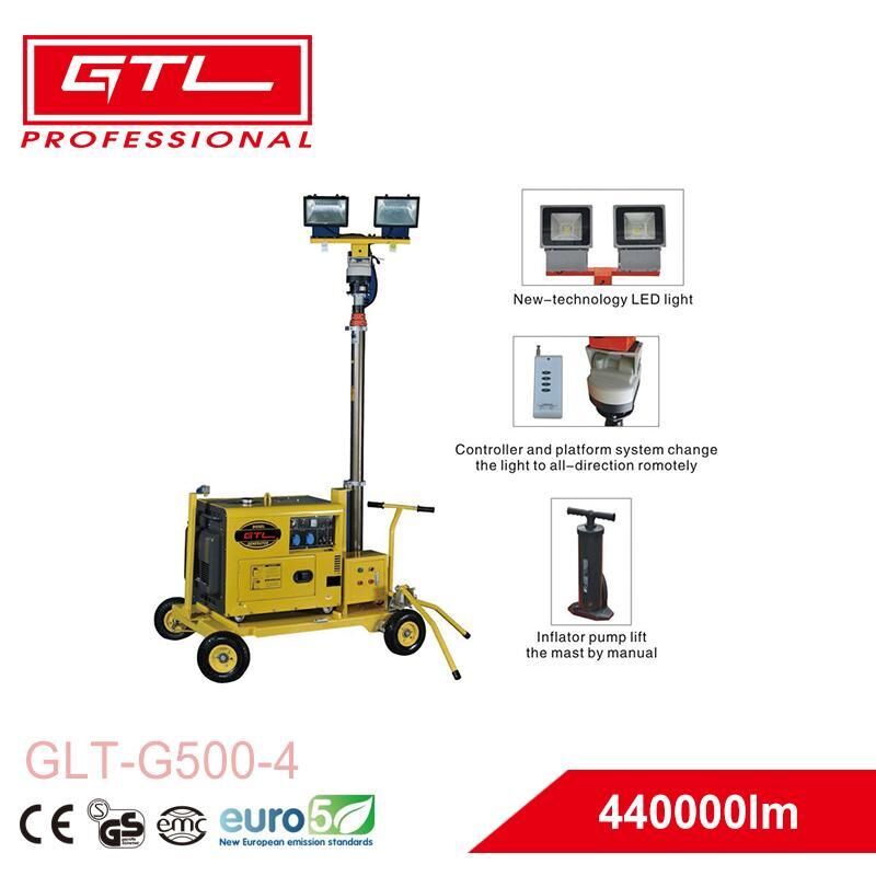 The GTL-G500-4 Mobile Light Tower is a diesel-powered lighting solution designed for construction sites and other outdoor applications requiring portable and powerful illumination. With its high-efficiency light fixtures and durable construction, it ensures uniform and long-lasting light coverage. The unique lamp design contributes to increased filament life, and the rotating tower provides versatility in light direction without needing to move the entire tower. The lockable, weather-resistant steel cabinet safeguards the electrical components, making this light tower a reliable choice for various outdoor lighting needs.