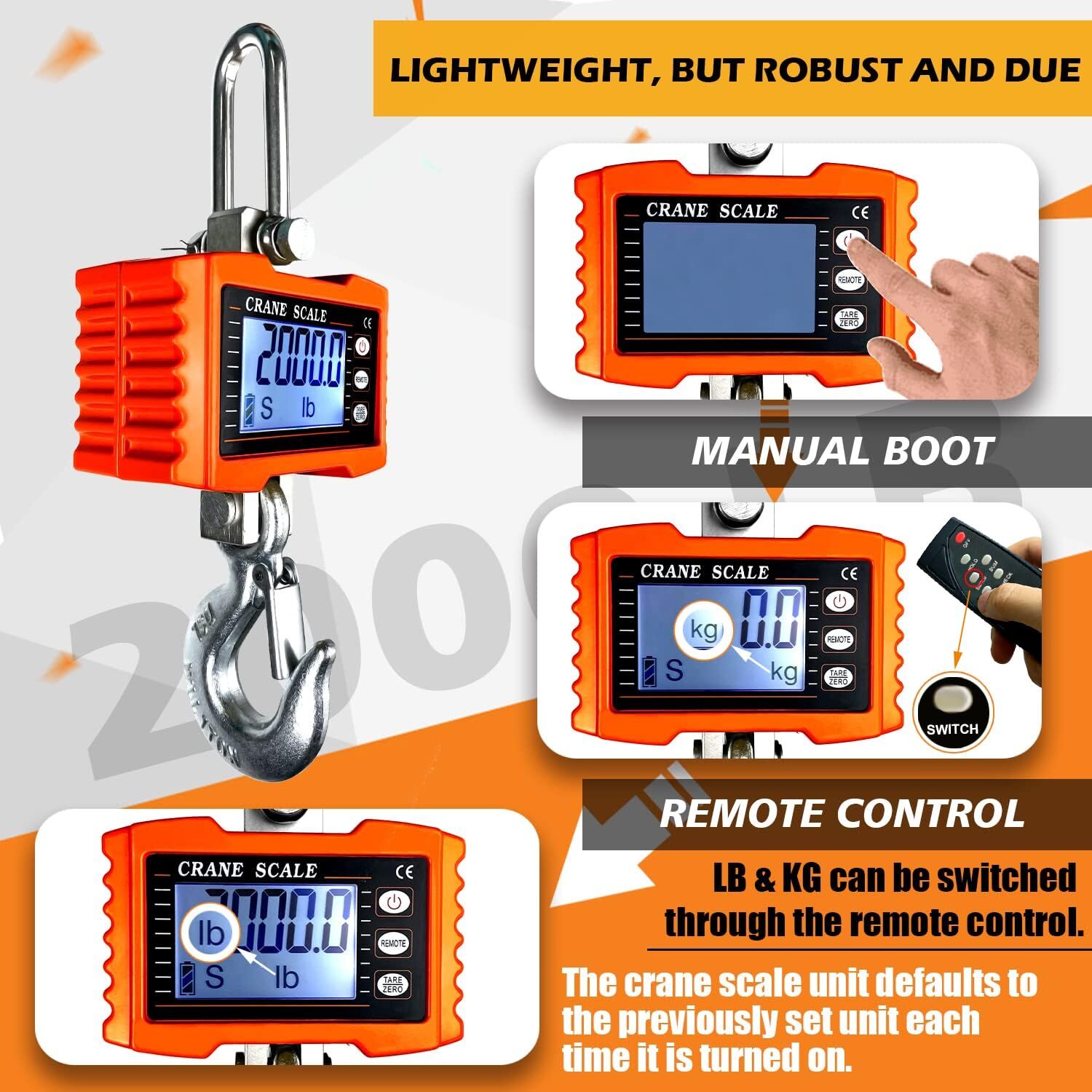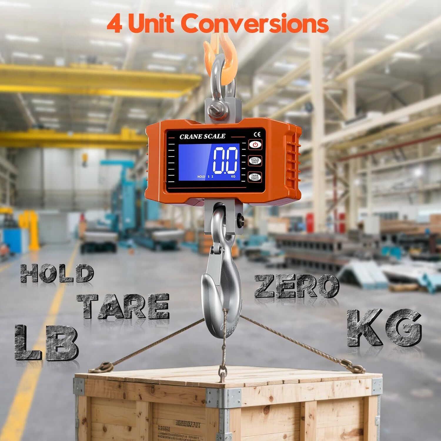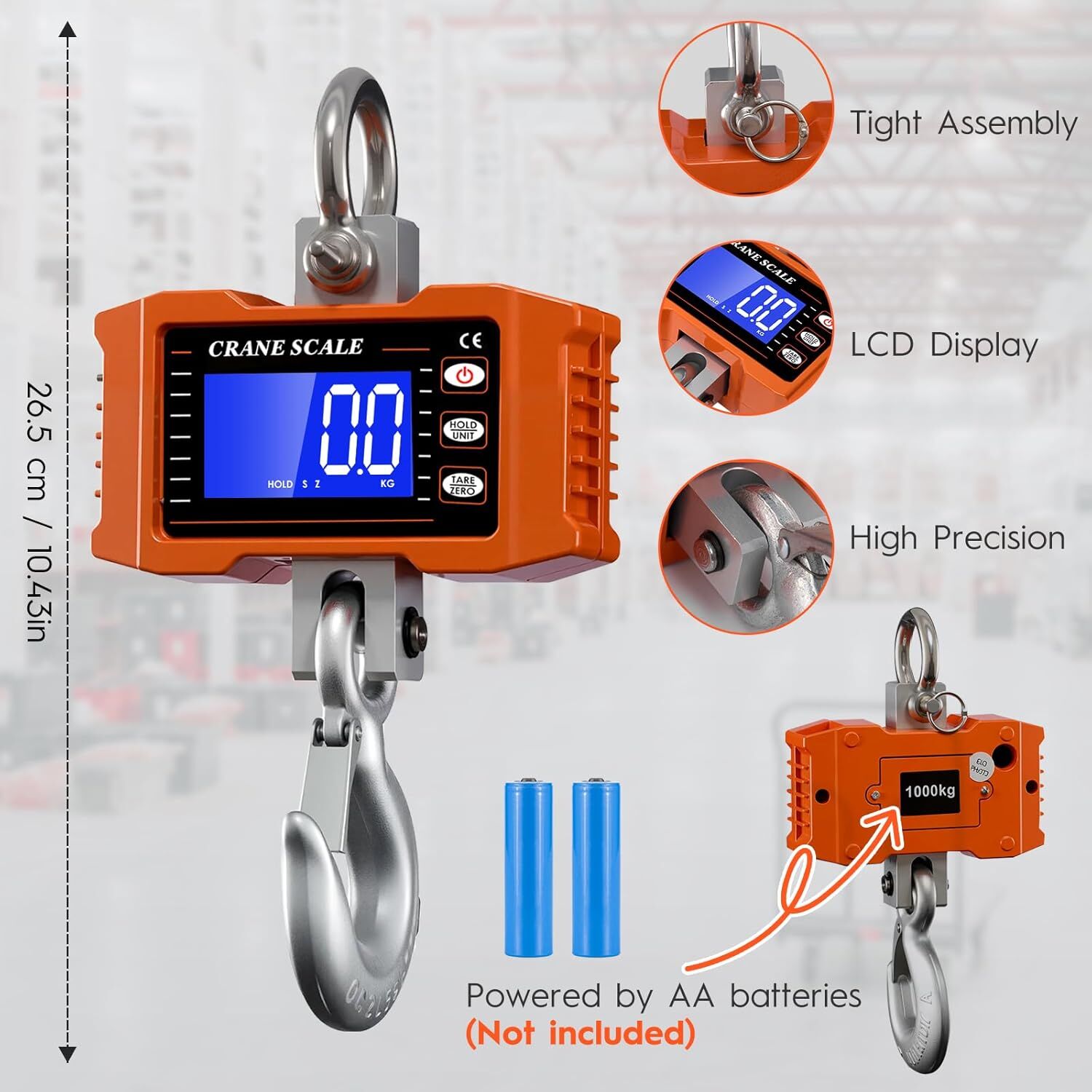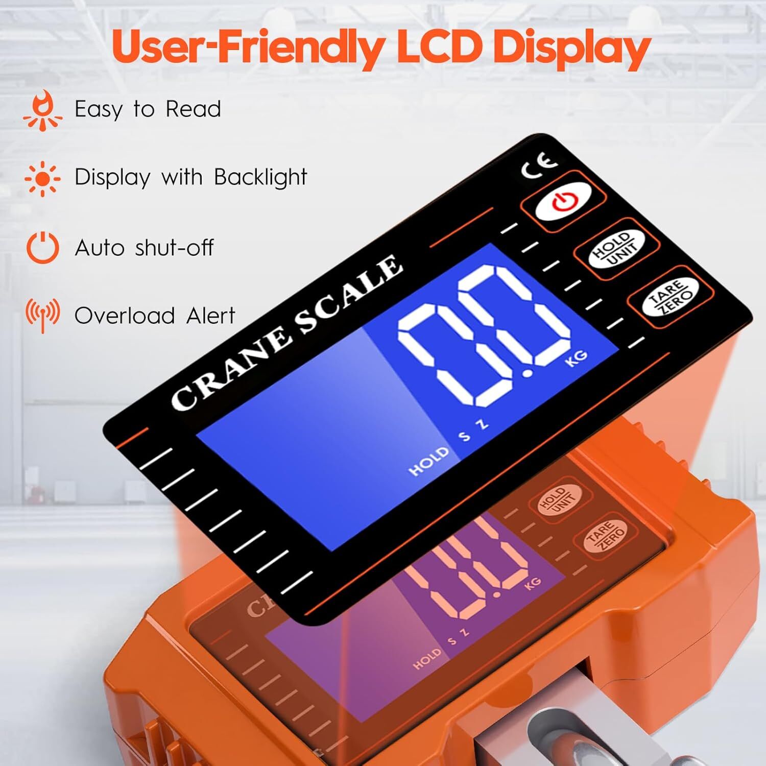 This digital crane scale combines professional functionality with rugged durability. Its large backlit LCD screen ensures clear visibility up to 15 feet, even in low light. Operate essential functions like tare, unit switch, and hold with just three buttons. Built with a forged aluminum body and steel hooks, it's protected against water, dust, and frost for reliable use in warehouses, farms, and outdoors. Powered by standard AA batteries, it offers high-precision weighing with a single-button recalibration feature for ultimate convenience and accuracy.