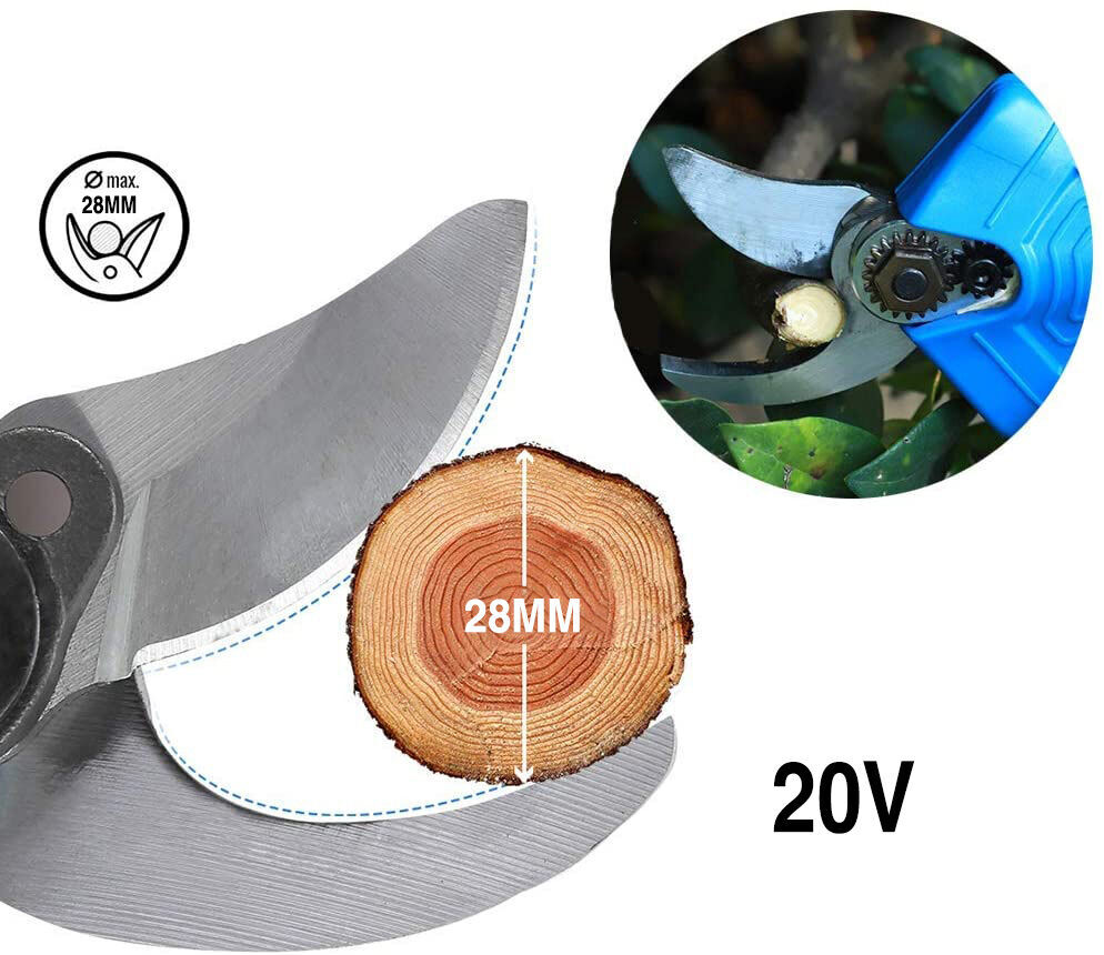 Cuchilla afilada que corta con suavidad: La cuchilla de esta tijera de podar eléctrica inalámbrica está forjada en acero de alto carbono SK5. Este material es duradero y afilado, lo que permite cortar ramas de hasta 28 mm de diámetro con suavidad y sin dañarlas.