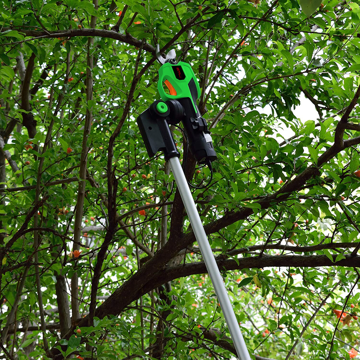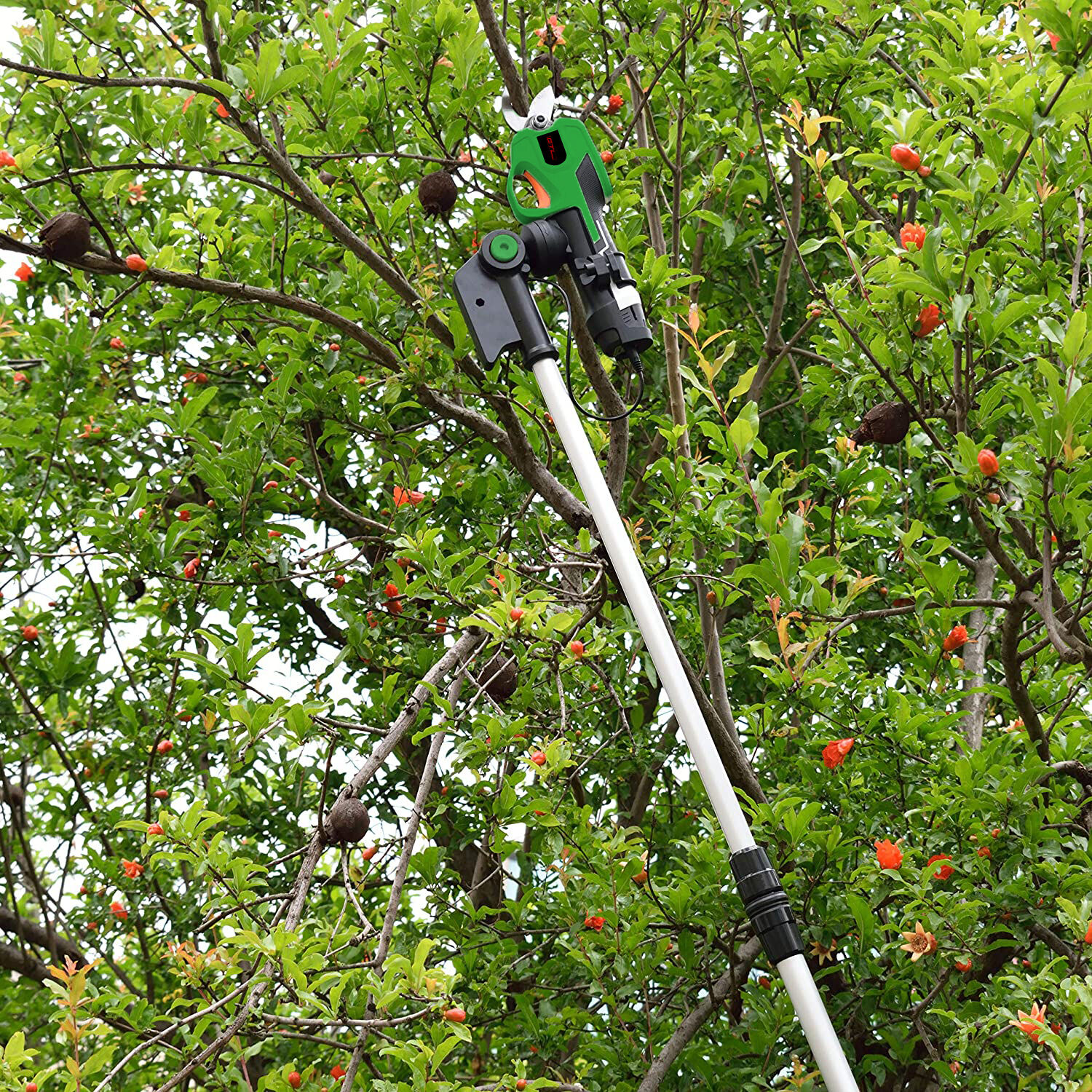 Pértiga telescópica: La varilla de extensión de 250 cm es ideal para cortar ramas altas. Además, es fácil de transportar y guardar.