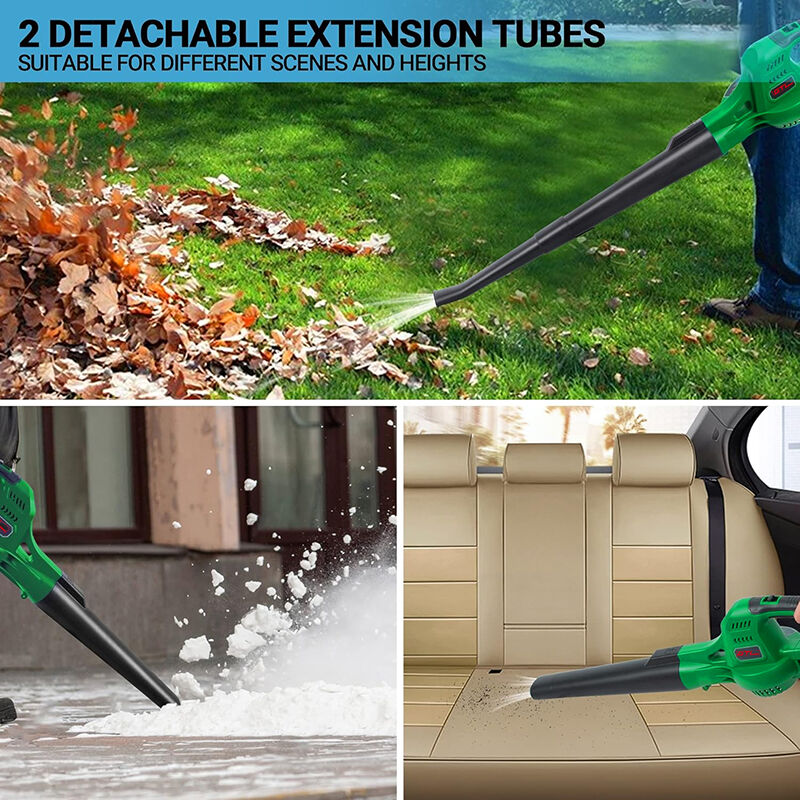 Inserte la batería y el tubo, y presione el botón del soplador y aspirador inalámbrico para que funcione en 3 segundos. Además, el tubo de extensión le permite conectar una o dos secciones del tubo del soplador. Cuando necesite limpiar las hojas caídas del suelo y la nieve ligera del techo, puede agregar el tubo de extensión para que no tenga que agacharse ni ponerse de puntillas y disfrutar de una experiencia de uso cómoda.