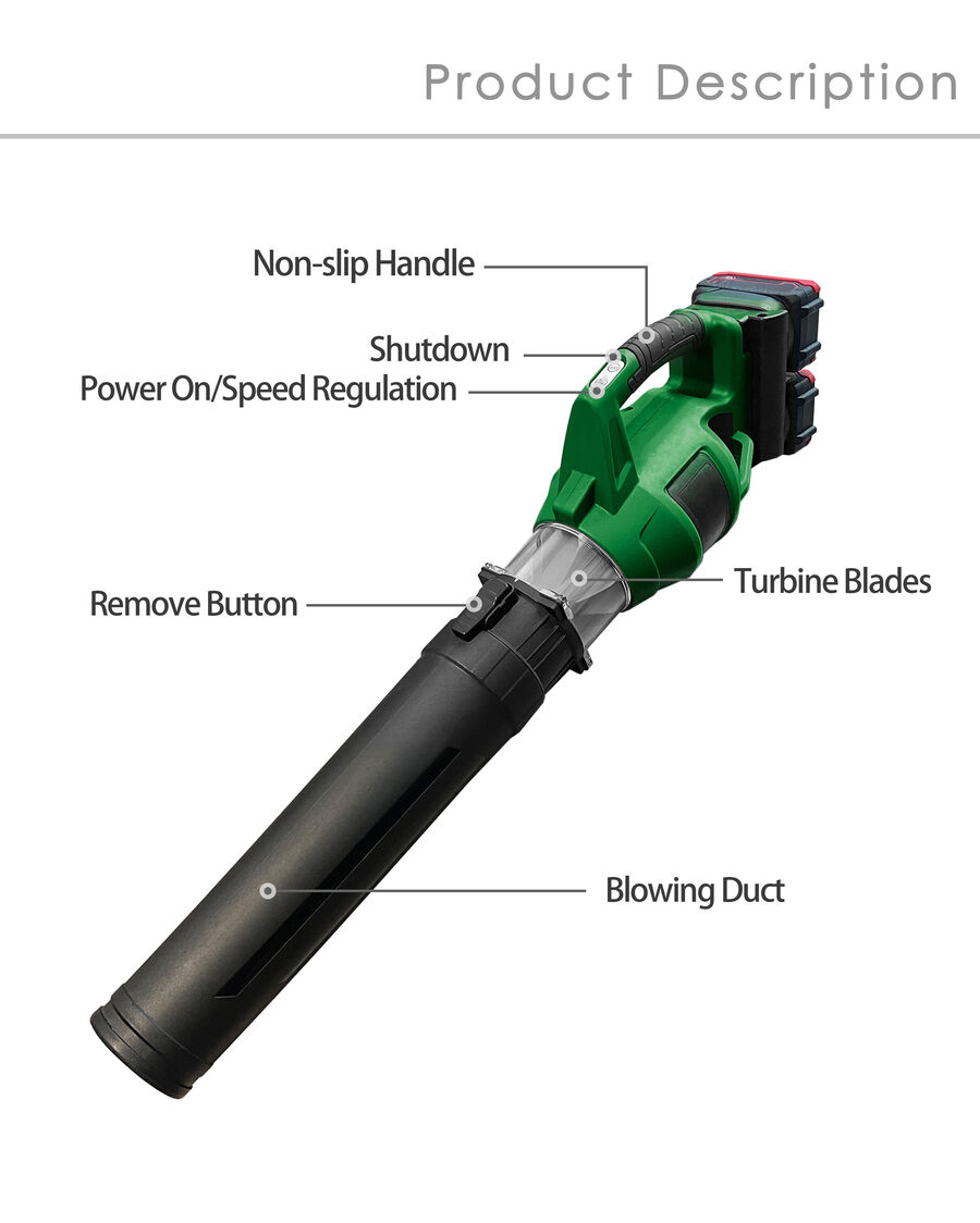 Este soplador eléctrico inalámbrico de 36 V, con su diseño liviano y su potente flujo de aire, es una herramienta ideal para la limpieza del hogar y el jardín, especialmente eficaz para limpiar rápidamente residuos húmedos o rebeldes.