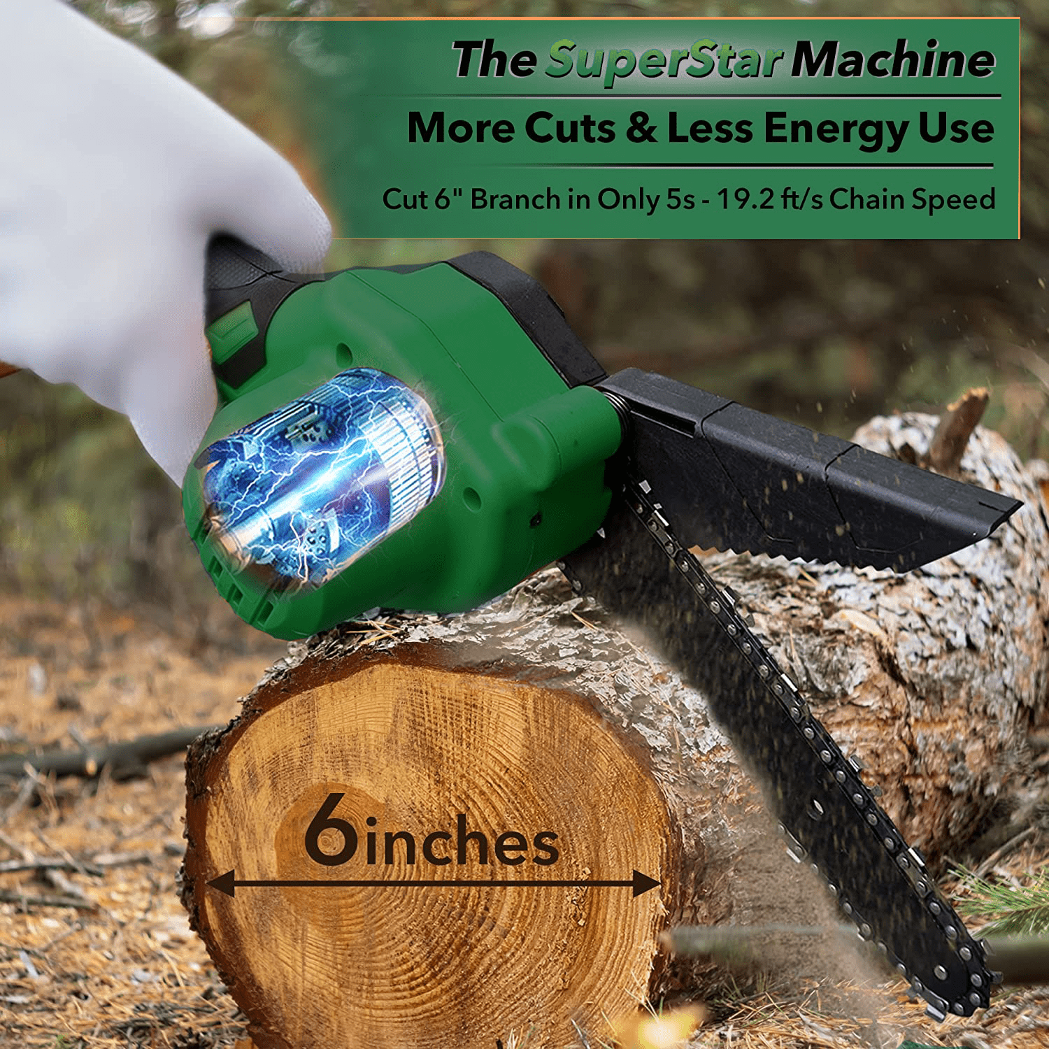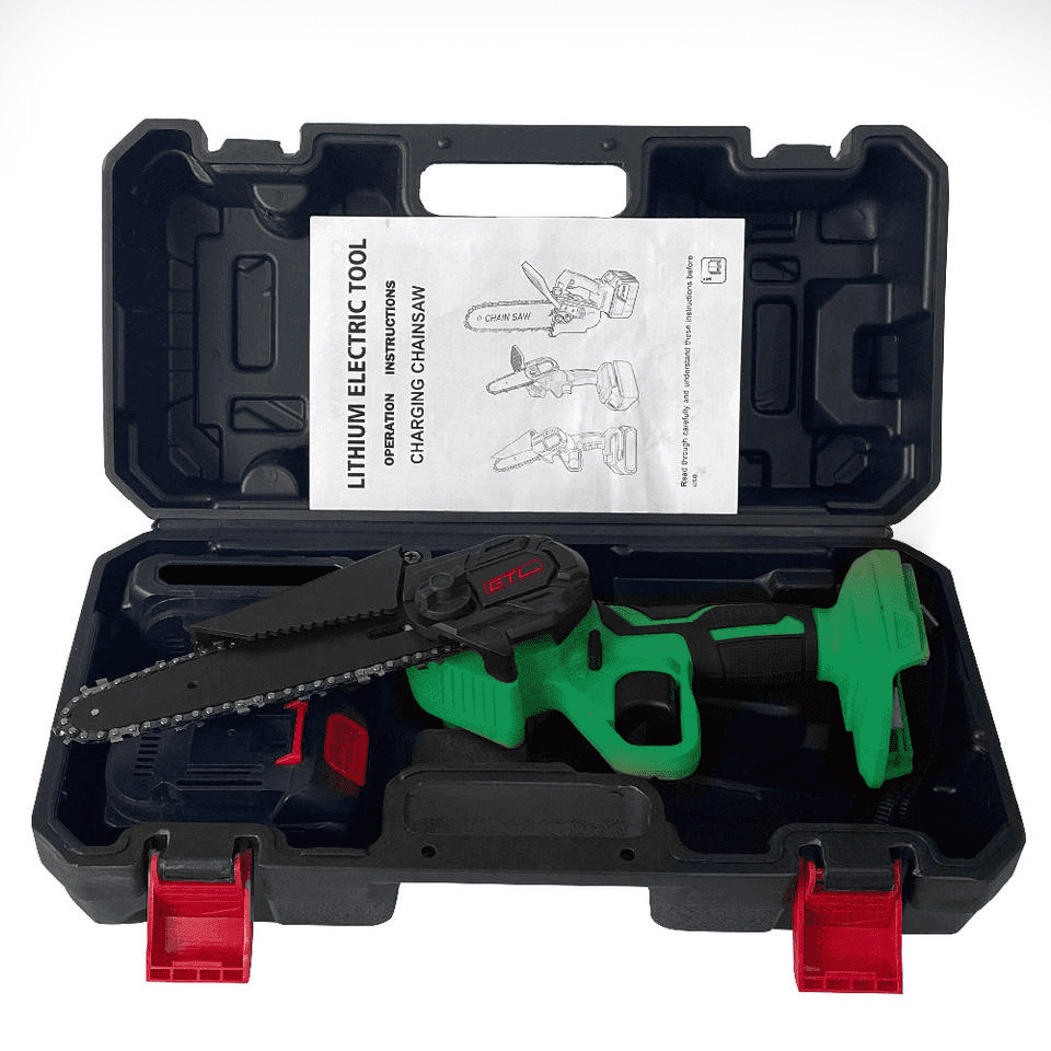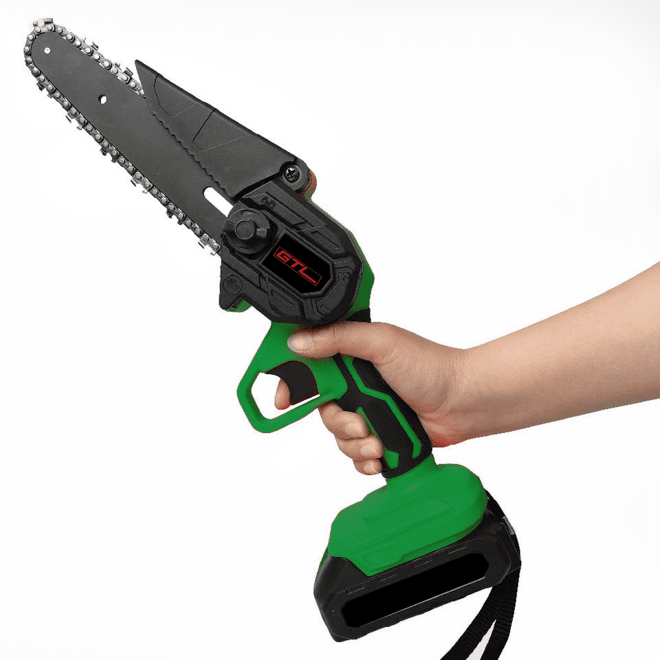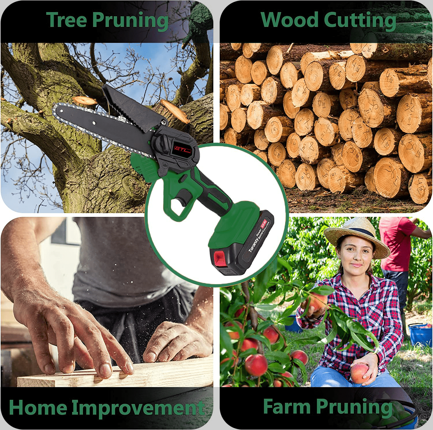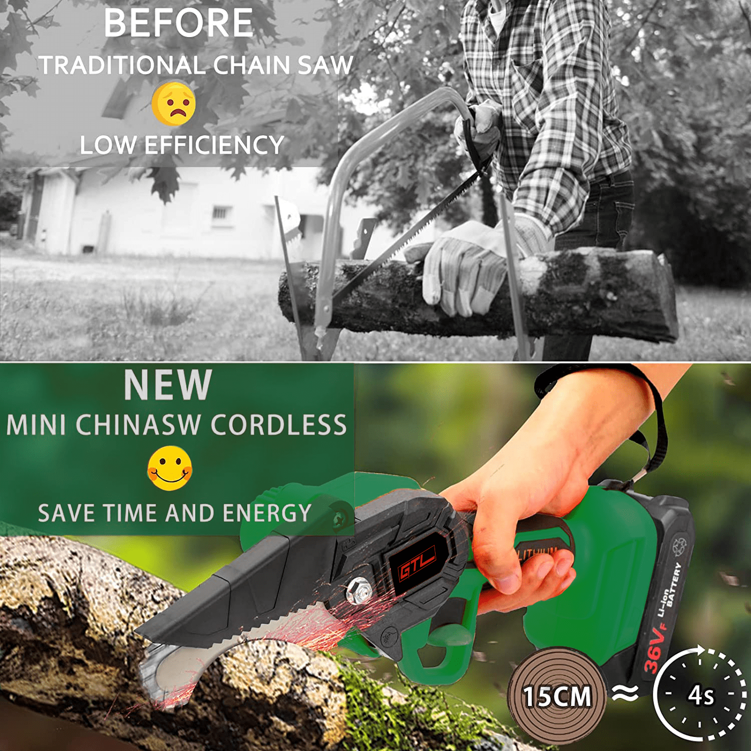 This cordless hand chain saw adapt high-quality guide chain which has undergone a deep quenching process ensures smooth cutting. The wood tooth design can make the chain saw stuck on the branch, cutting efficiency is higher and faster.