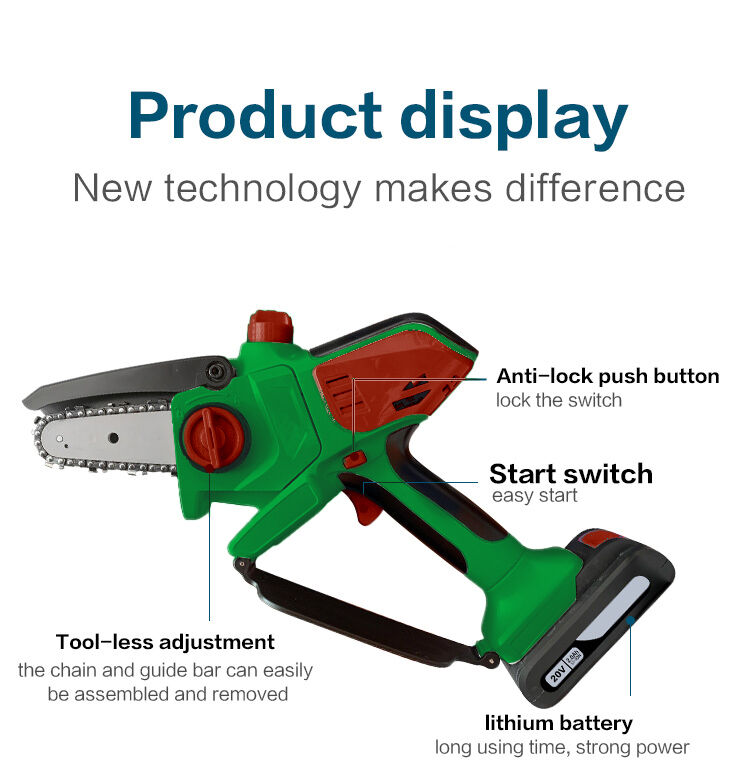 The 20V Cordless Chainsaw is a high-performance, safety-oriented tool featuring a dual-action start, anti-lock push button, and tool-less chain adjustment for ease of use. With a lightweight design, long-lasting lithium battery, and durable, wear-resistant chain and bar, it's perfect for a variety of cutting tasks in home and garden settings.