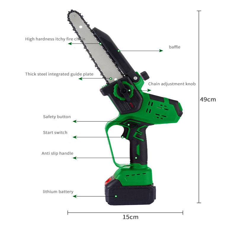 The cordless chainsaw features a durable itchy fire chain, a protective and adjustable baffle, a sturdy steel guide plate, tool-free chain adjustment, a compact and ergonomic design with safety features, and a long-lasting lithium battery powered by an efficient brushless pure copper motor.
