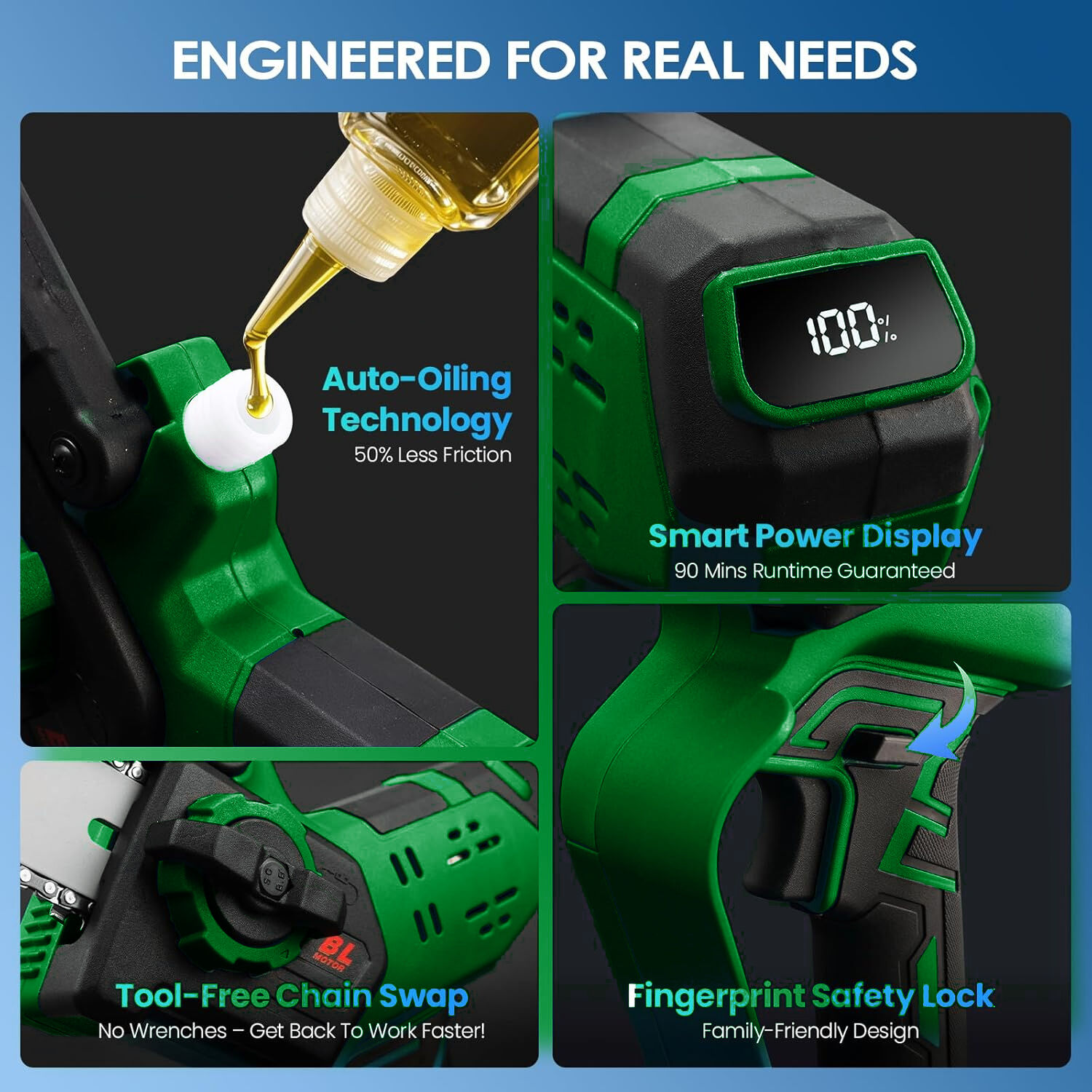 Upgrade efficiency with auto-lubrication for blade maintenance, real-time power indicators to track usage, and a safety lock switch to prevent accidental starts. Every detail prioritizes operational safety and hassle-free control