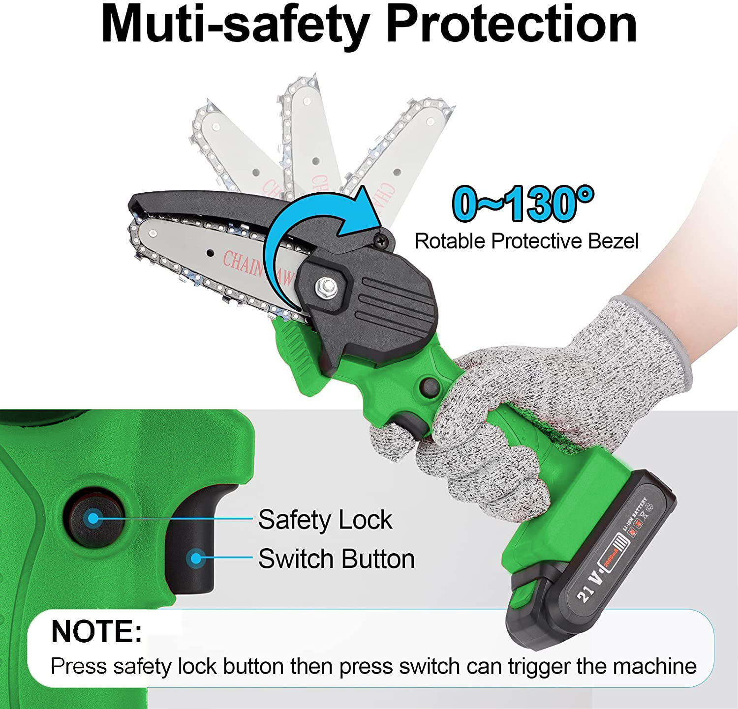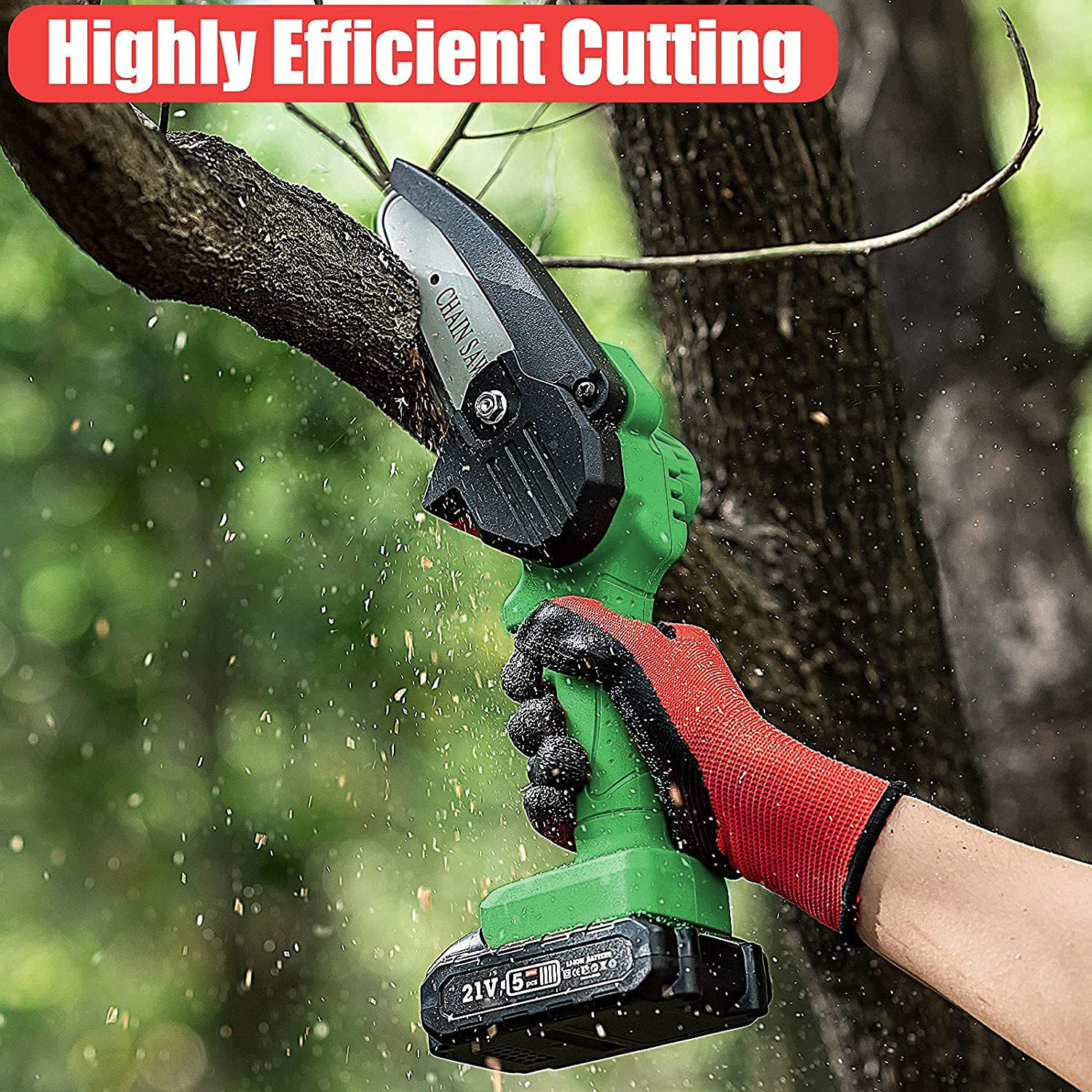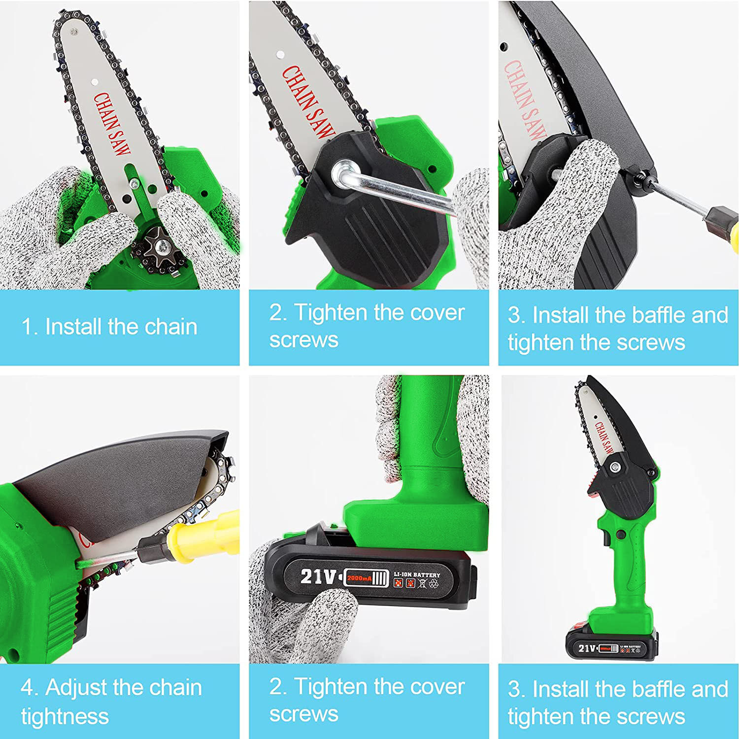 This cordless hand chain saw adapt high-quality guide chain which has undergone a deep quenching process ensures smooth cutting. The wood tooth design can make the chain saw stuck on the branch, cutting efficiency is higher and faster.