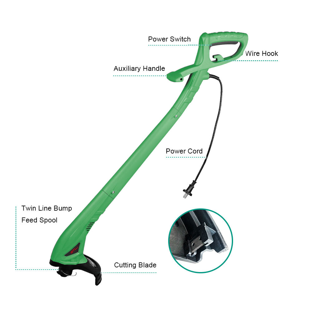 The electric grass trimmer is a versatile and efficient landscaping tool, featuring dual voltage compatibility, high-speed cutting, and a durable twin line bump feed system, all in a safety-certified design with attractive packaging.