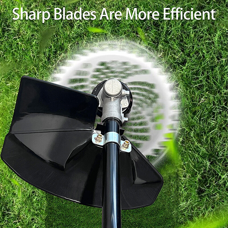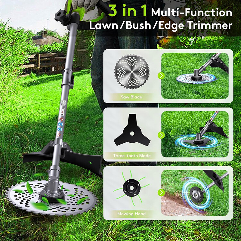 Battery operated weed wacker comes with 4 kinds blades options which easy to swap out. Manganese steel circle saw blades for cutting thicker brushes and branches which is 6inch. It can precise in edging and hedge trimming,and not hurting the plants you don't want to cut.3Teeth Steel Brush Cutter Blades and Long Metal blades for cutting lawns, weeds and small branches. Plastic blades only use on light thin grass, not for mowing thick shrub branches.