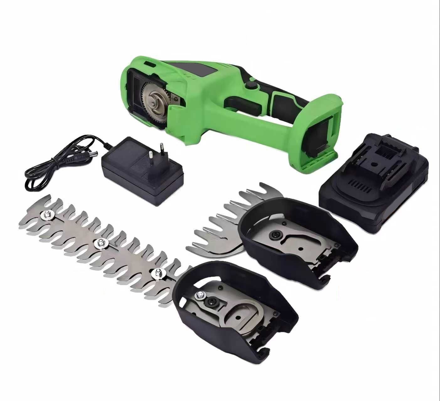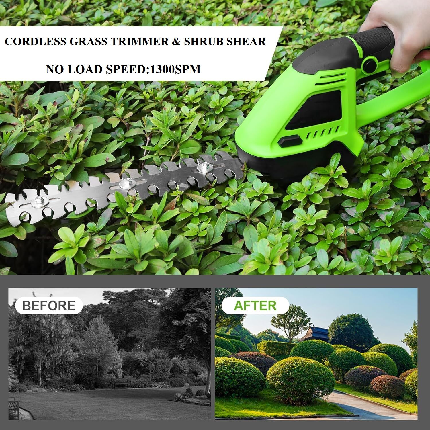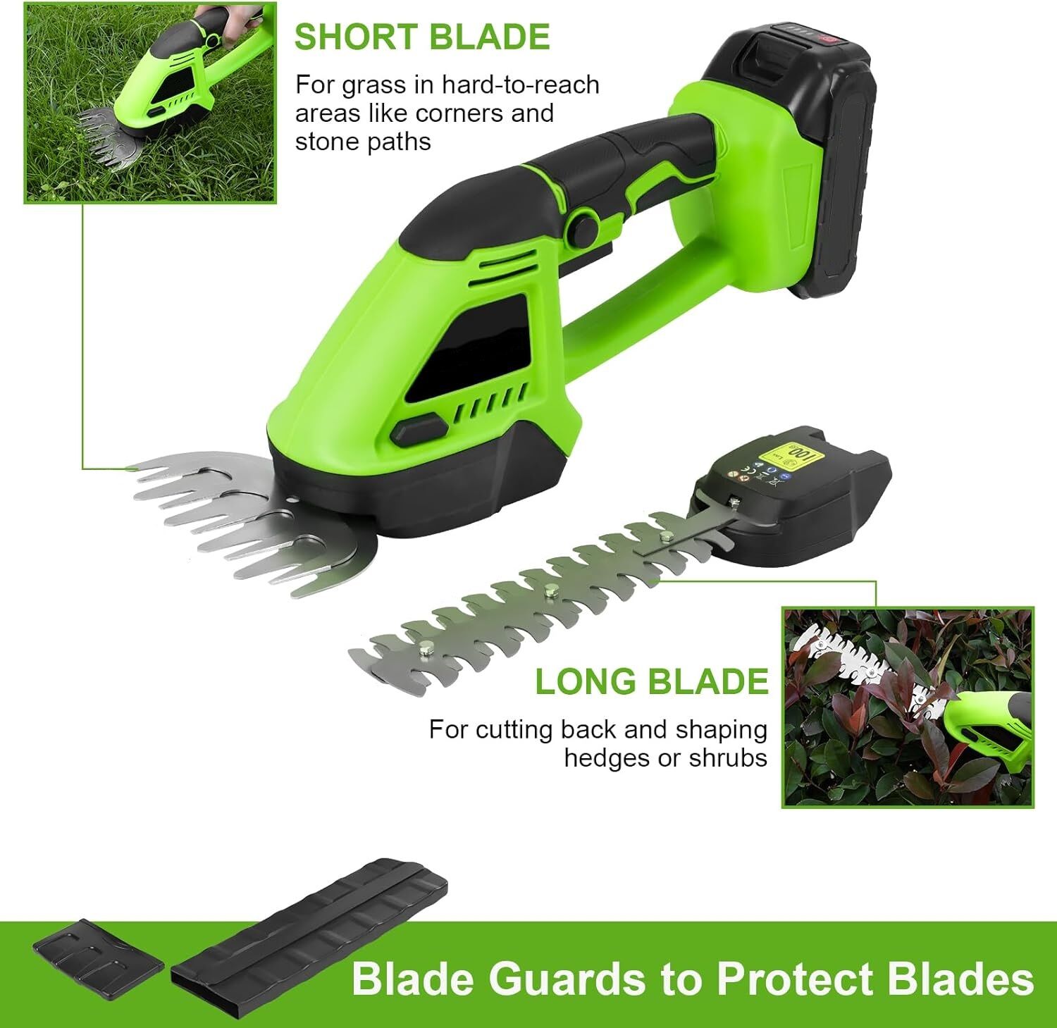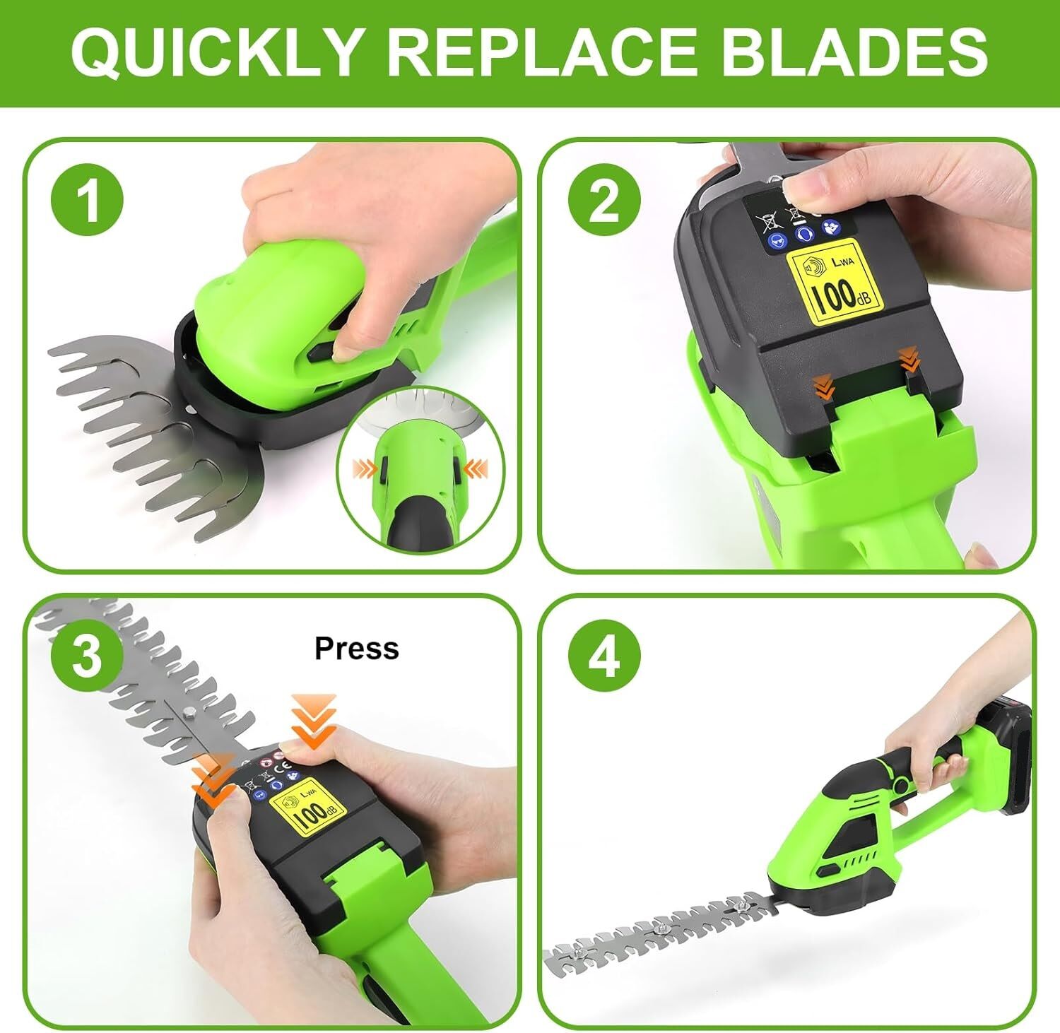 Cortasetos y tijeras para arbustos inalámbricas: Esta herramienta eléctrica de jardinería 2 en 1 incluye una cuchilla para césped y otra para arbustos; el cortasetos de mano inalámbrico permite cambiar las cuchillas rápidamente con el botón de liberación; la cuchilla corta se utiliza para cortar césped y la cuchilla larga para cortar ramas finas de setos, arbustos y plantas ornamentales.