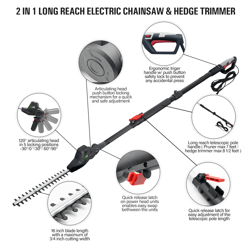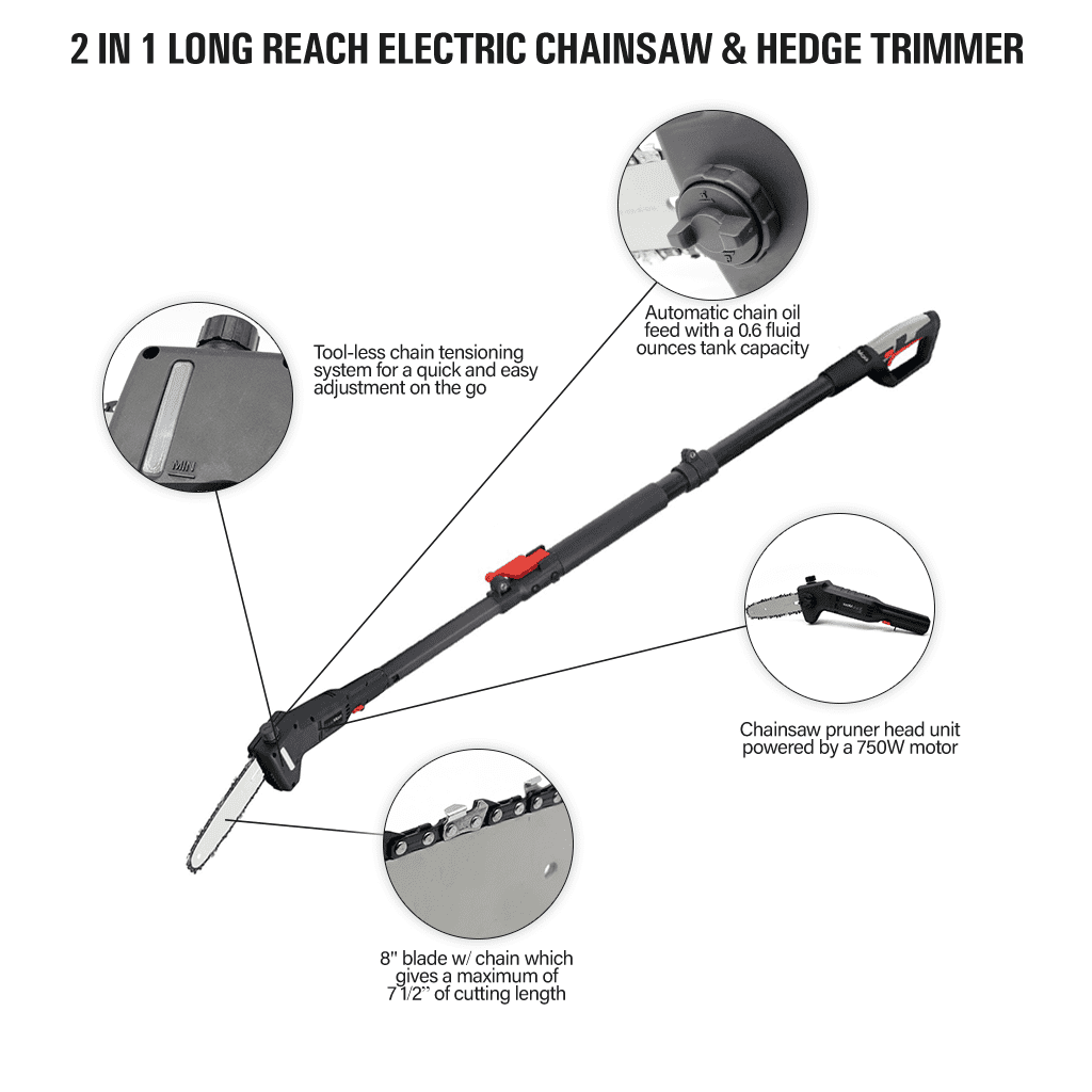 The EHT010 2-in-1 Pole Hedge Trimmer and Chainsaw offers a 500W cutting power with a 450mm blade and extends up to 2.7m for hard-to-reach areas. Its adjustable cutting head and ergonomic design ensure comfort and control. The chainsaw operates at 700W with an 8" chain, making it perfect for heavy-duty garden maintenance. Safety features include a two-way switch for added protection.