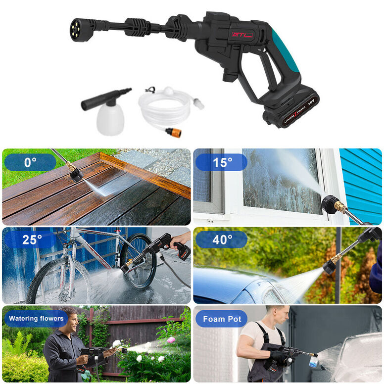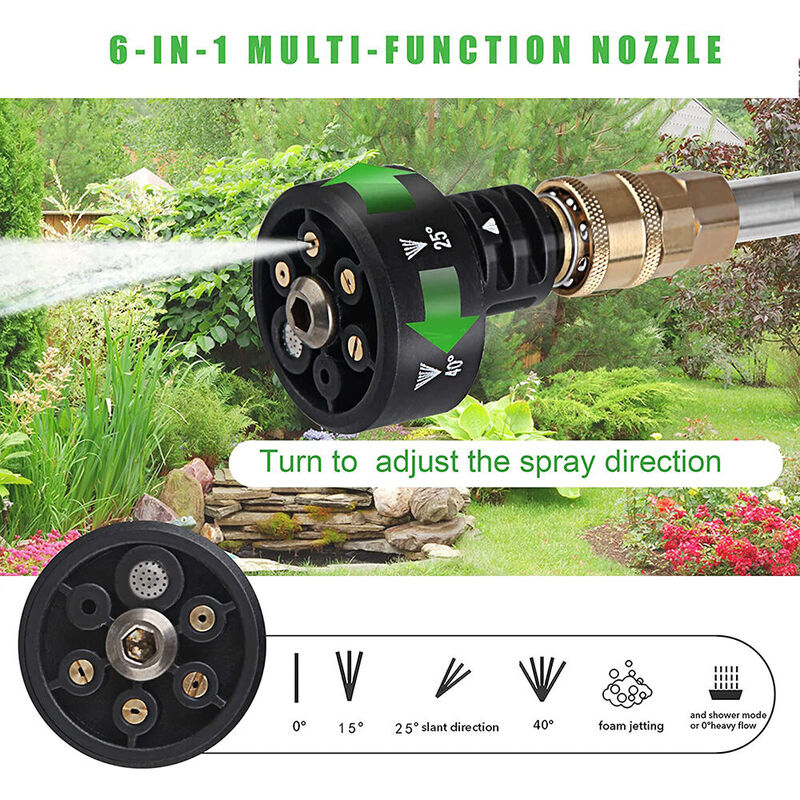 Boquilla multifunción 6 en 1: La hidrolimpiadora cuenta con una boquilla ajustable 6 en 1 con diferentes ajustes: 0°, 15°, 25° de inclinación, 40°, chorro de espuma y modo ducha o caudal intenso de 0°. Esto permite a los usuarios seleccionar el modo adecuado para sus necesidades de limpieza, ahorrando potencialmente agua.