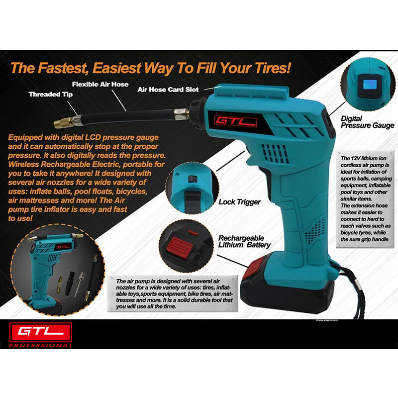 | Item Description: | The Compact, Portable, Digital, Cordless, Rechargeable Air Pump, Air Compressor, Tyre Inflator with DC12V 1.3Ah Li-ion Battery |
