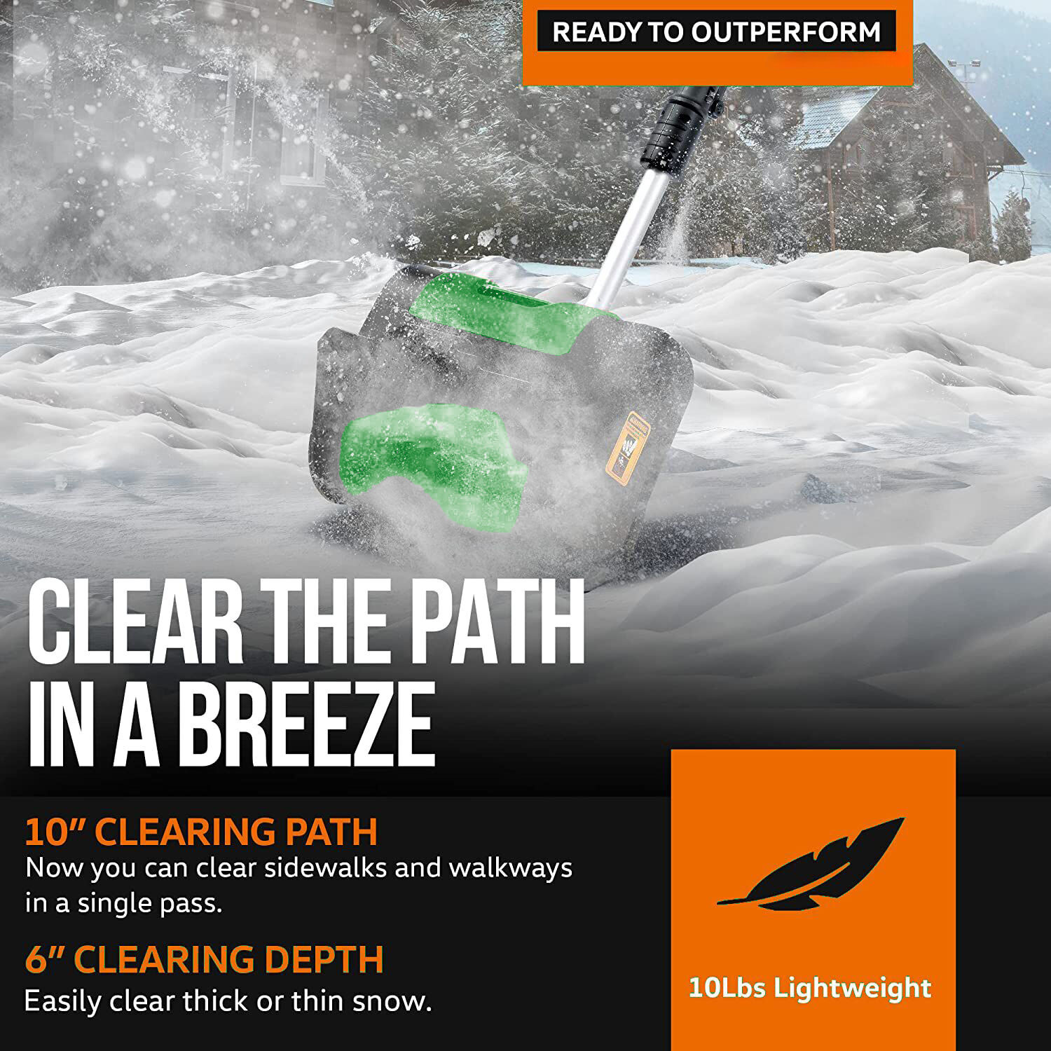 Clearing Path: 10" clearing path width for clearing sidewalks and walkways in a single pass. 6" clearing depth for handling various snow thicknesses.