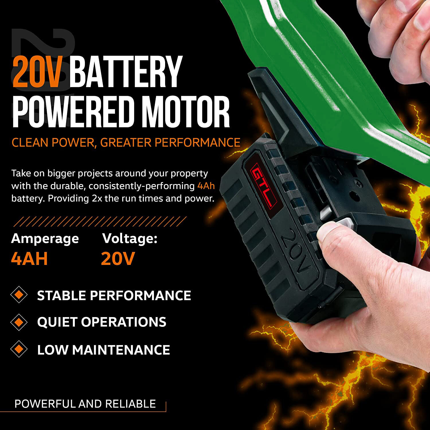20V Battery Powered Motor: Powered by a 4Ah battery for greater performance and 2x the run times compared to standard batteries. Voltage of 20V for powerful and reliable operation.