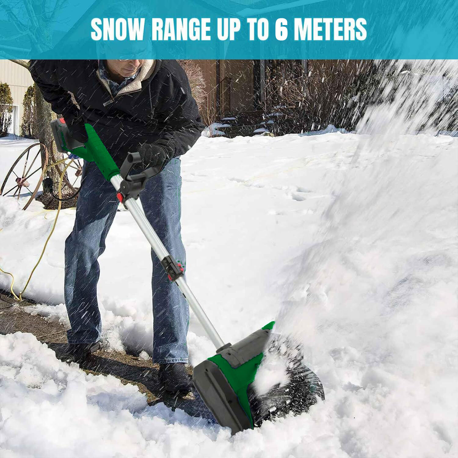 Potente rendimiento: Con un ancho de trabajo de 28 cm y una profundidad de 18 cm, esta quitanieves puede limpiar grandes cantidades de nieve en una sola pasada, alcanzando alturas de hasta 6 m.