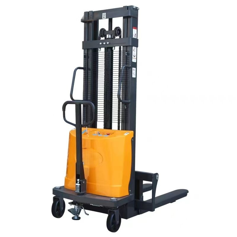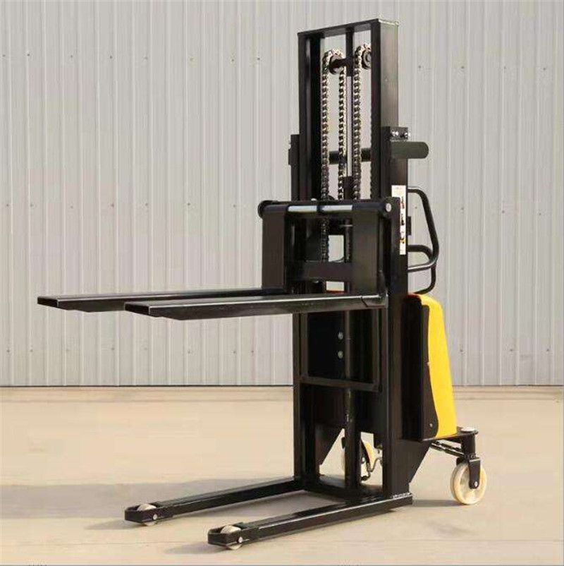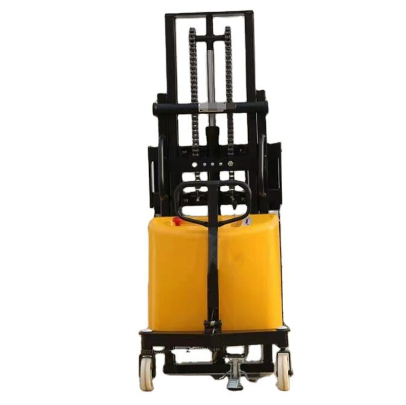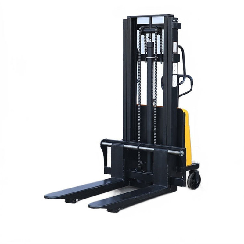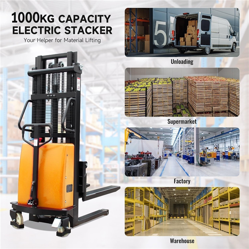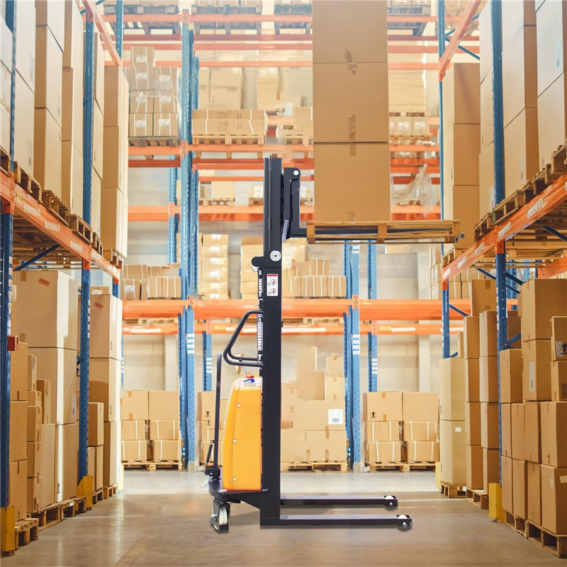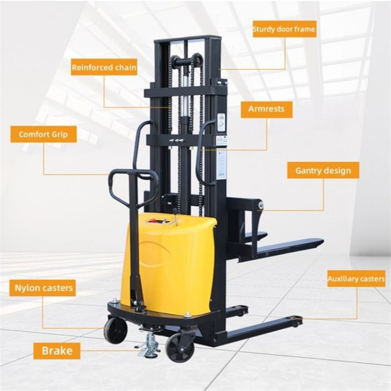 This electric stacker with 1000kg capacity fits various pallets, offering high cost-performance. Its adjustable forks lower to leg level. Equipped with an explosion-proof valve, foot brake, and over-discharge protection, it ensures safety and extends battery life.