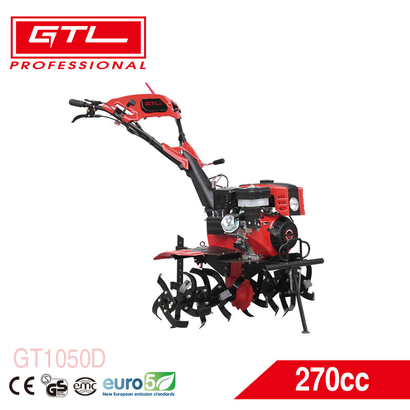 La cultivadora rotativa de gasolina GT1050D, equipada con un motor OHV de cuatro tiempos de 270 cc, ofrece un potente rendimiento para diversas tareas de cultivo agrícola y mantenimiento de jardinería. Su ancho de trabajo ajustable de 1050 a 1400 mm, junto con sus púas de acero autoafilables, garantiza eficiencia y precisión en el cultivo del suelo.
