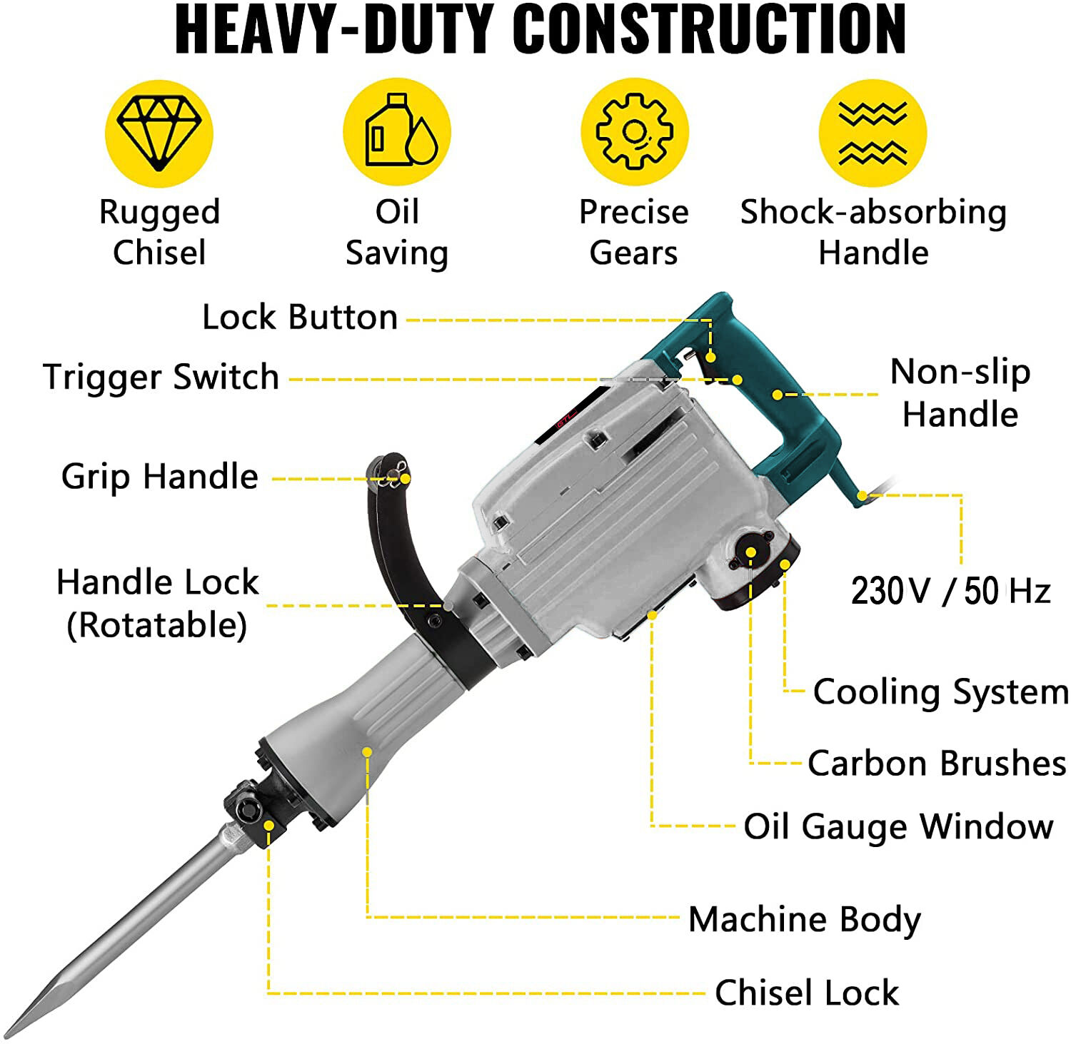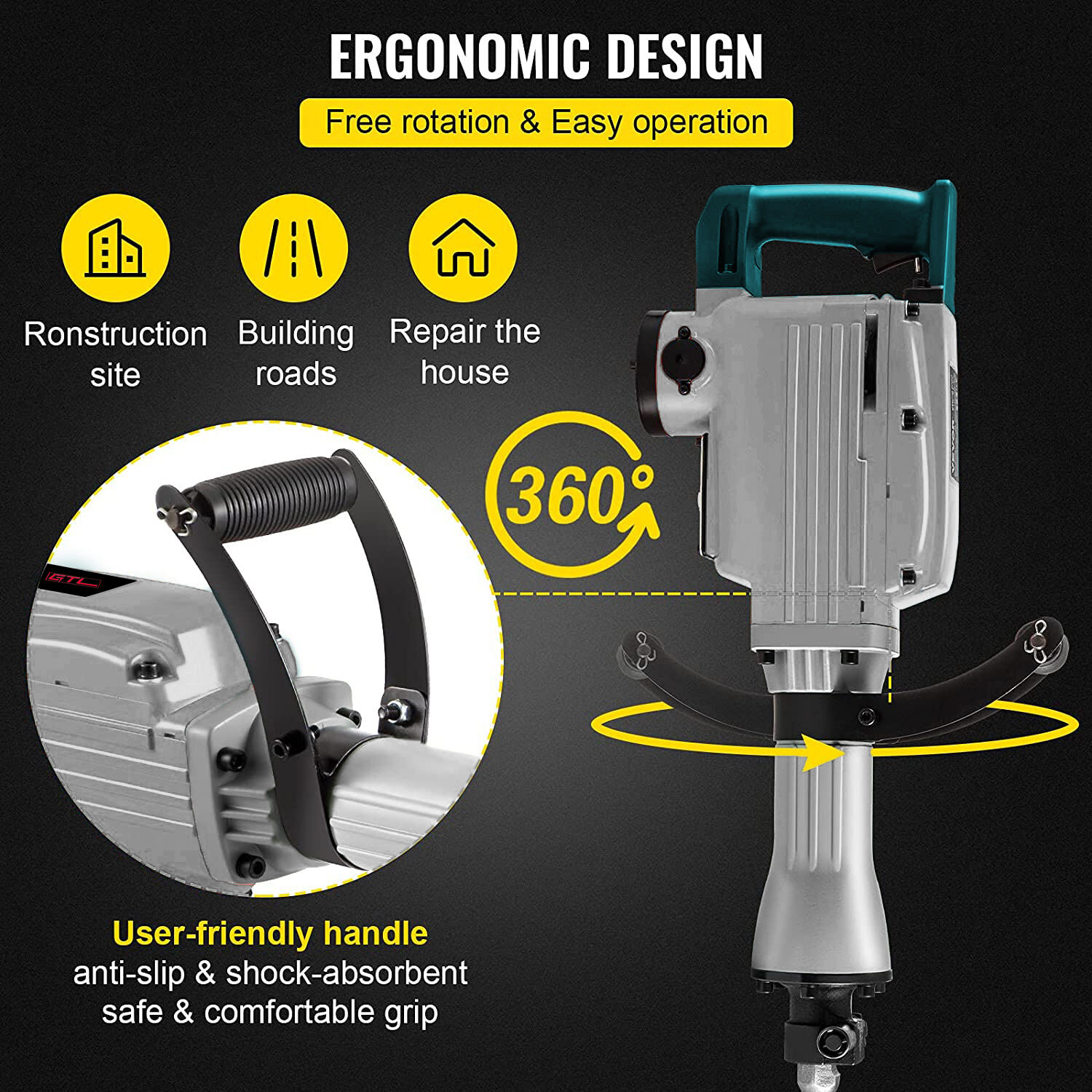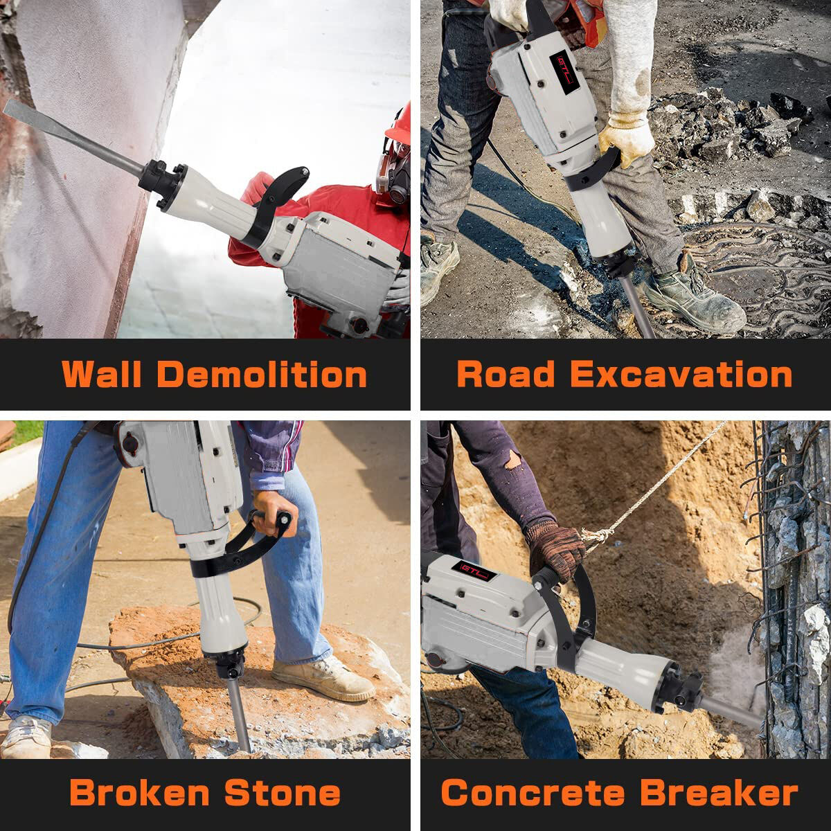 Versatile Applications: This jack hammer is perfect for a range of tasks including demolition, trenching, chipping, and breaking through materials such as concrete, block, brick, tile stucco, and more, including housing foundation removal, concrete slab, and oil chimney.