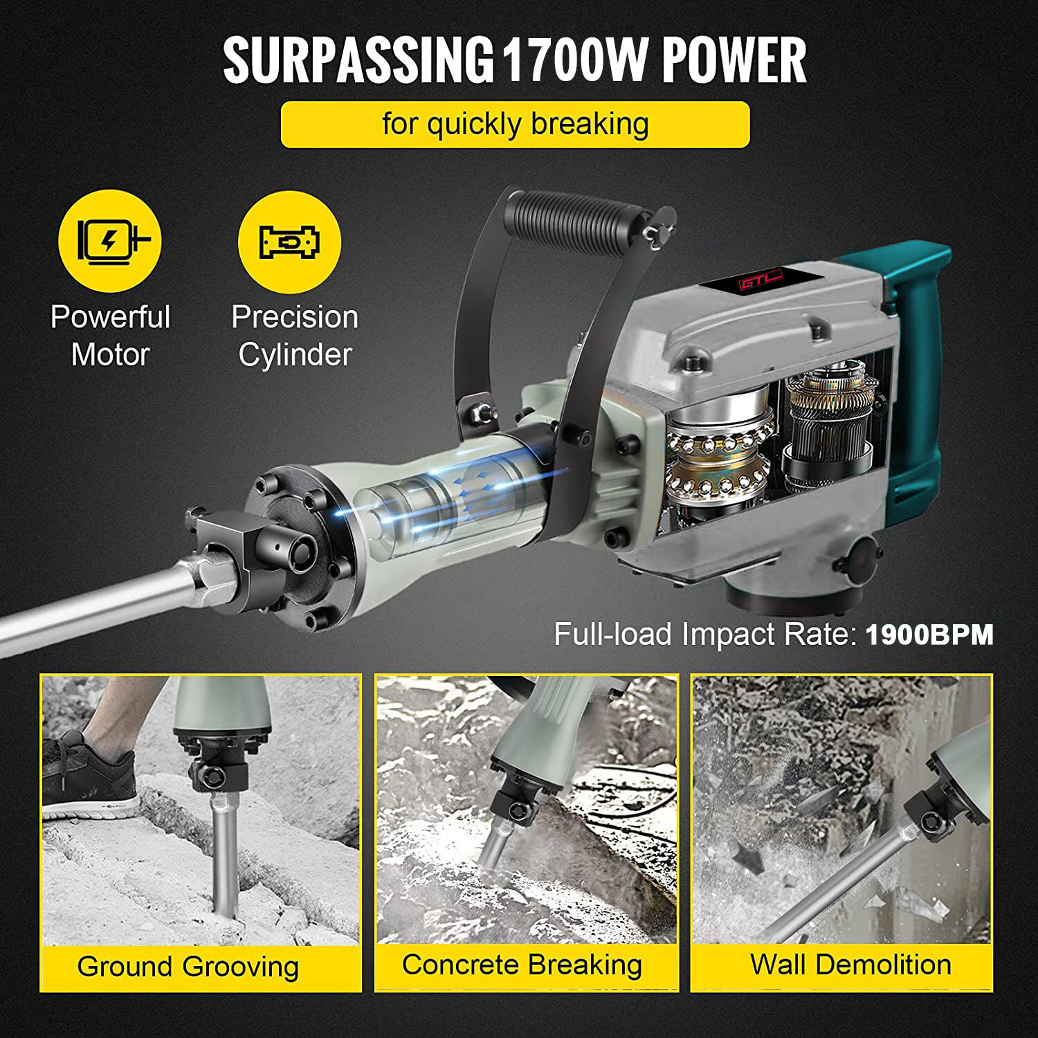 This 1700W, 1900bpm demolition hammer is designed to be a powerful and versatile tool for a wide range of construction and demolition tasks, with features that ensure both performance and protection.