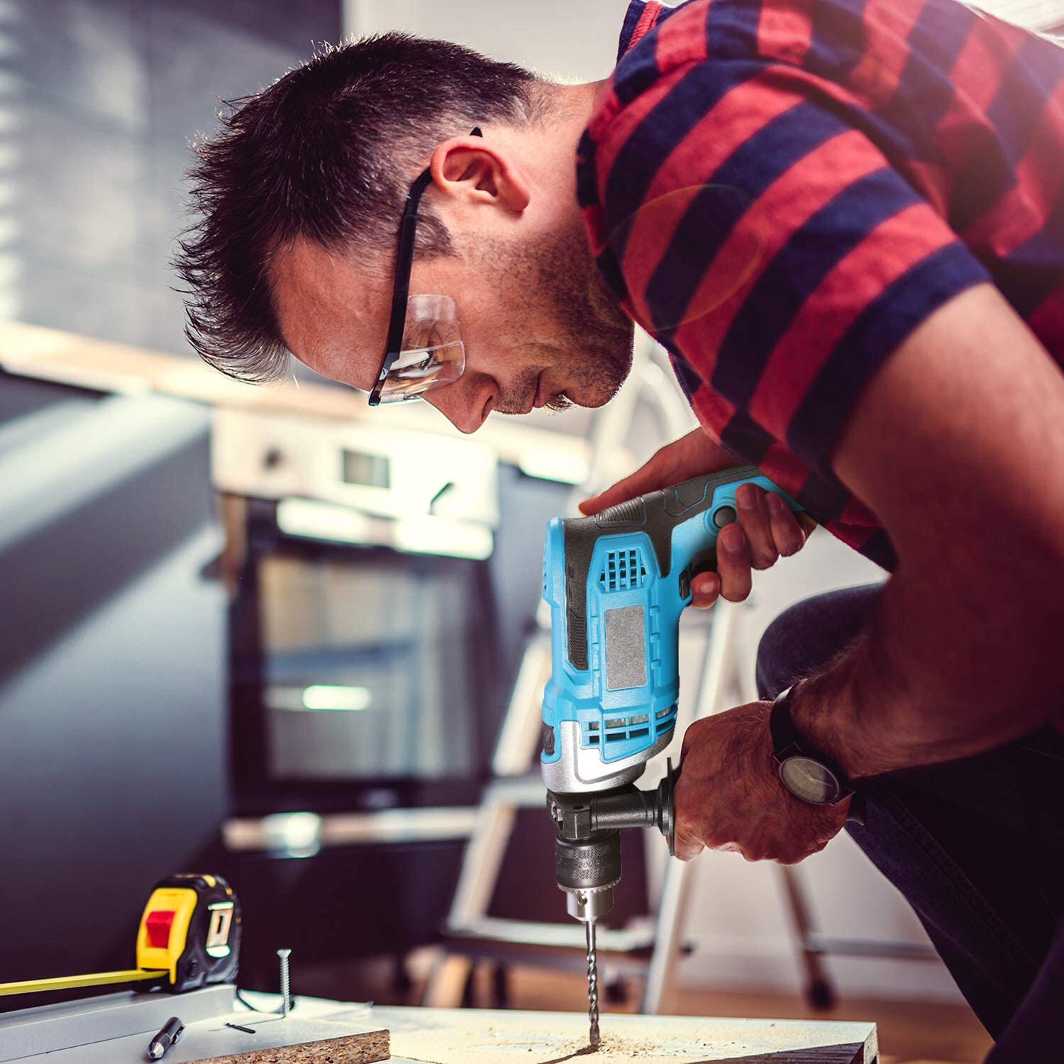 Martillo e impacto 2 en 1: Al activar o desactivar el mecanismo de impacto del taladro percutor según la tarea, no solo cuenta con la función de perforación, sino que también funciona como un taladro de impacto que proporciona una rápida sucesión de golpes cortos para perforar hormigón, piedra, madera y metal con menos esfuerzo.