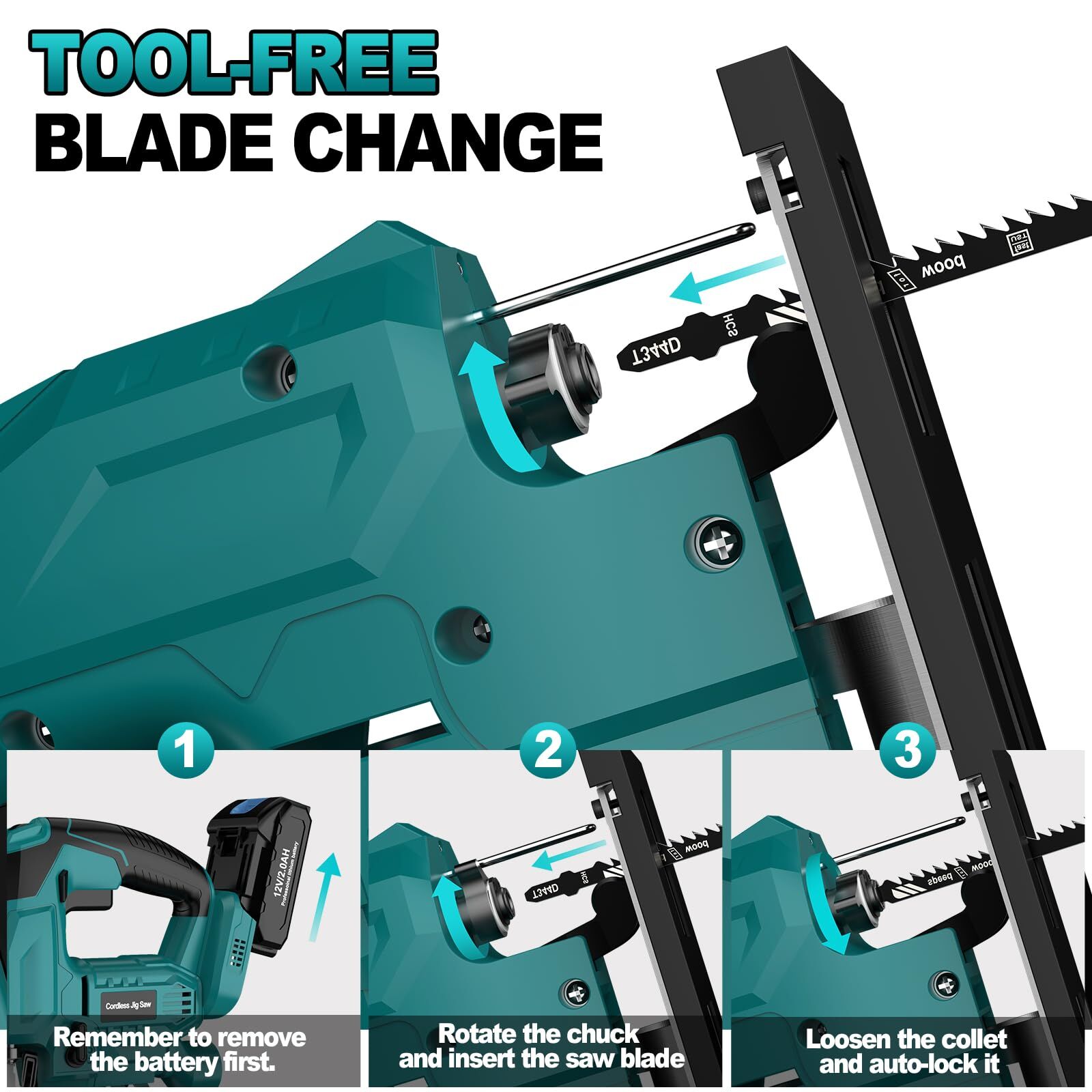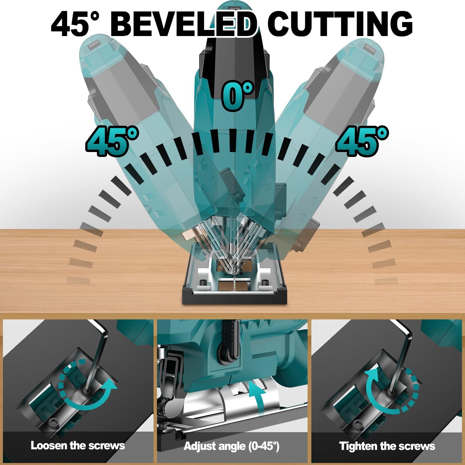 Tool-free Blade Change & Safety Lock:Enjoy hassle-free blade changes and safety button with our cordless 18V jigsaw. when the safety lock is engaged, This allows for improving work efficiency while ensuring comfort and safety. Switching blades is quick and effortless, ensuring minimal downtime during your projects. Warm tip: Always remove the battery from machine before doing any work on the jig saw.