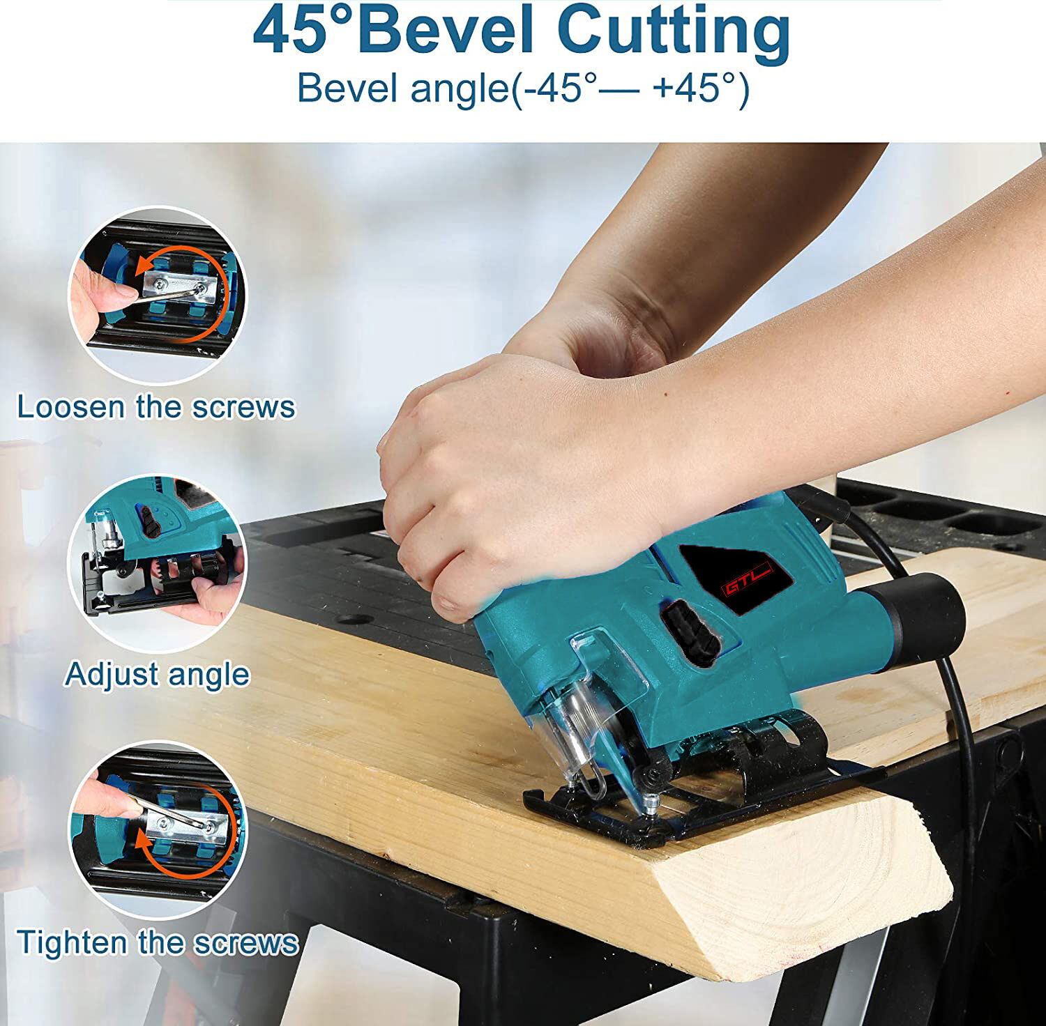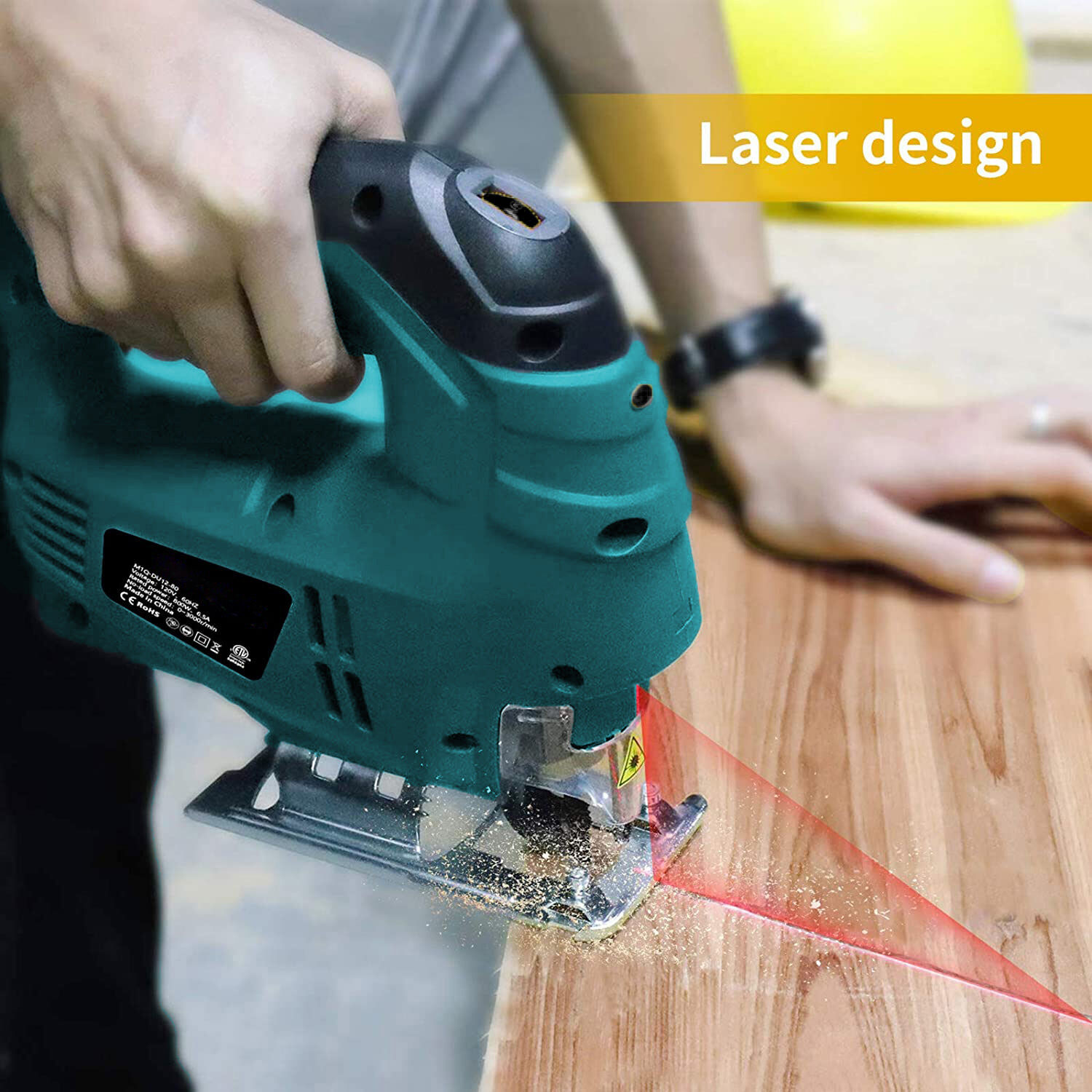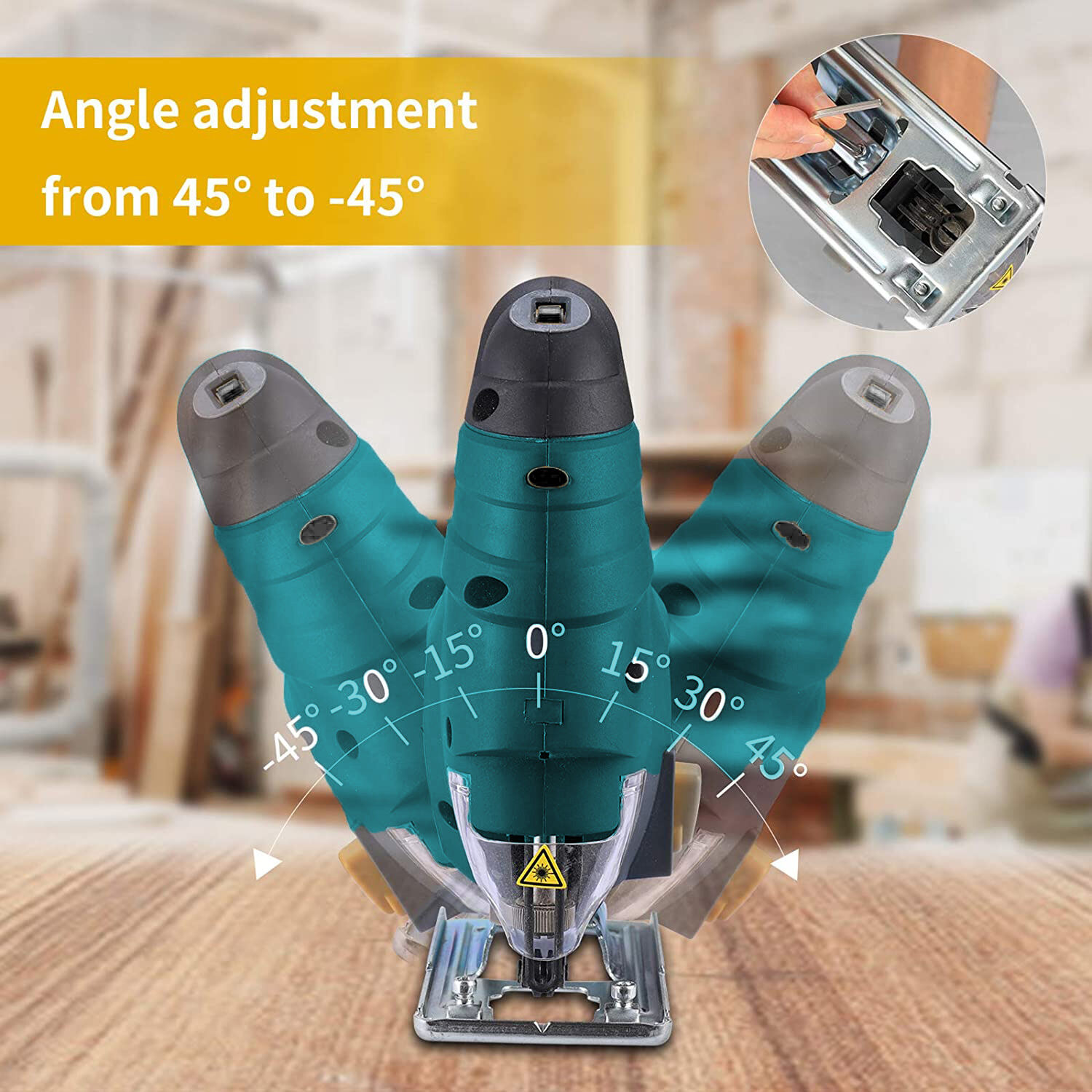 LASER GUIDE AND ANGLE MAX 45°: Equipped with laser guide and scale guide, the electric jigsaw make cutting more precise. Adjusts the right and left angle to 45°, which can be used to do more difficult work.
