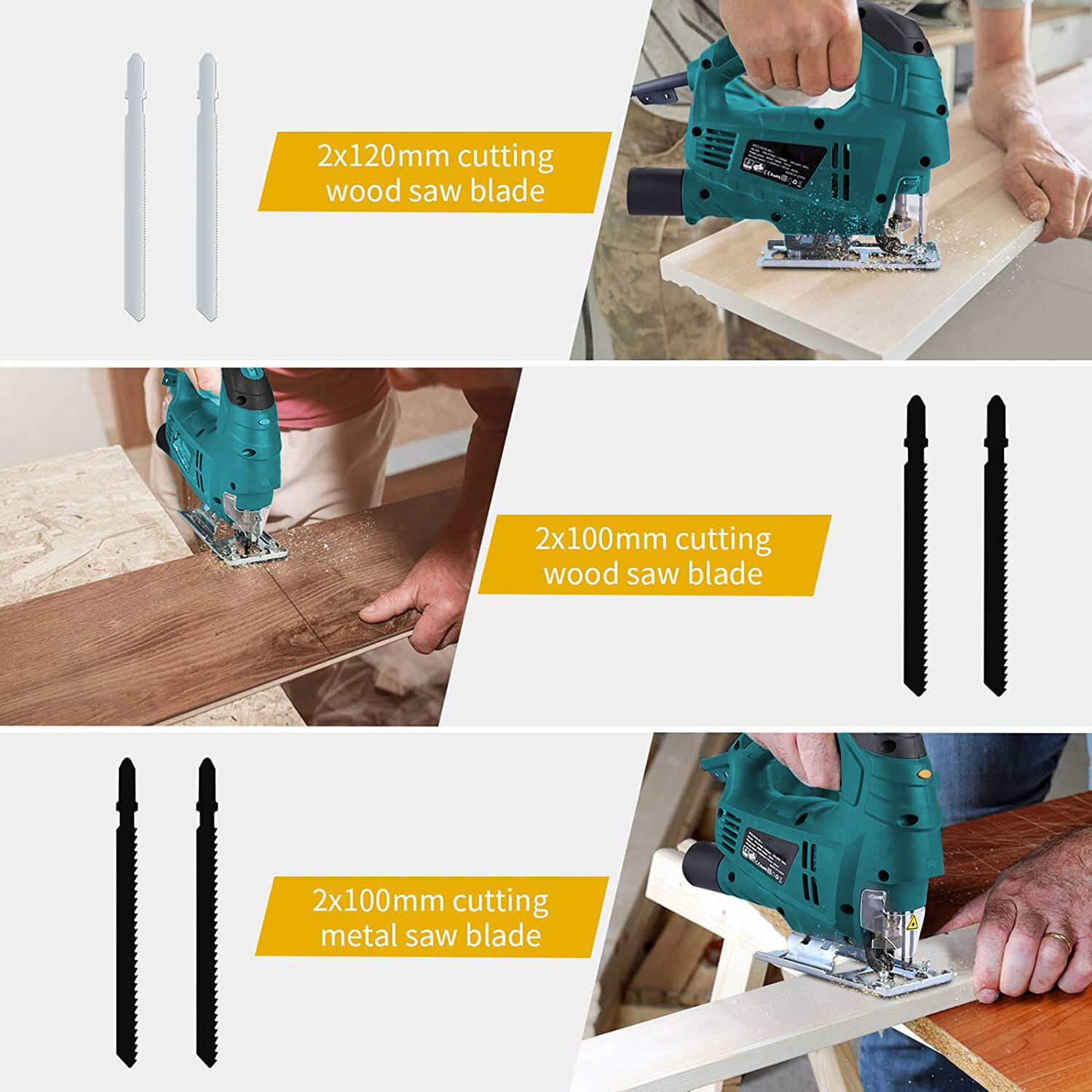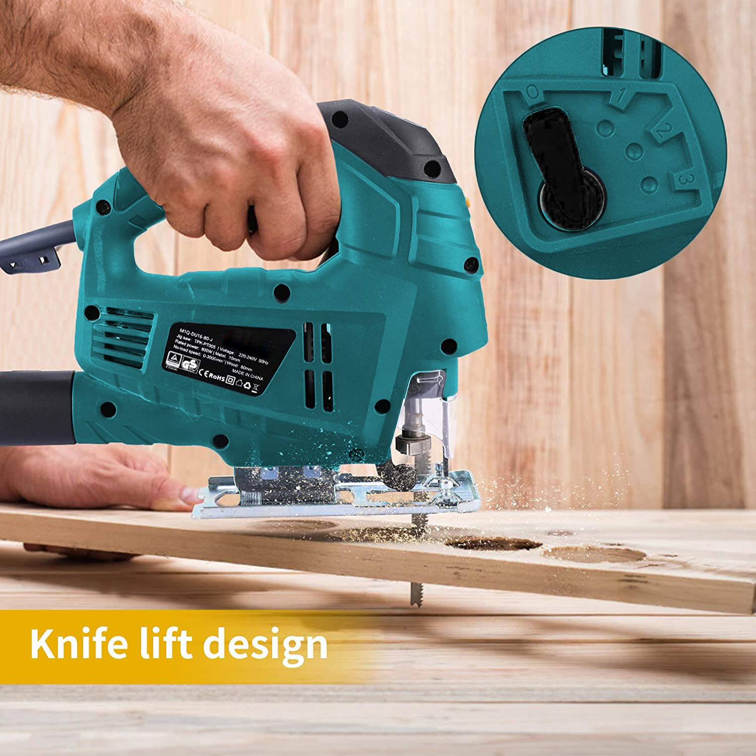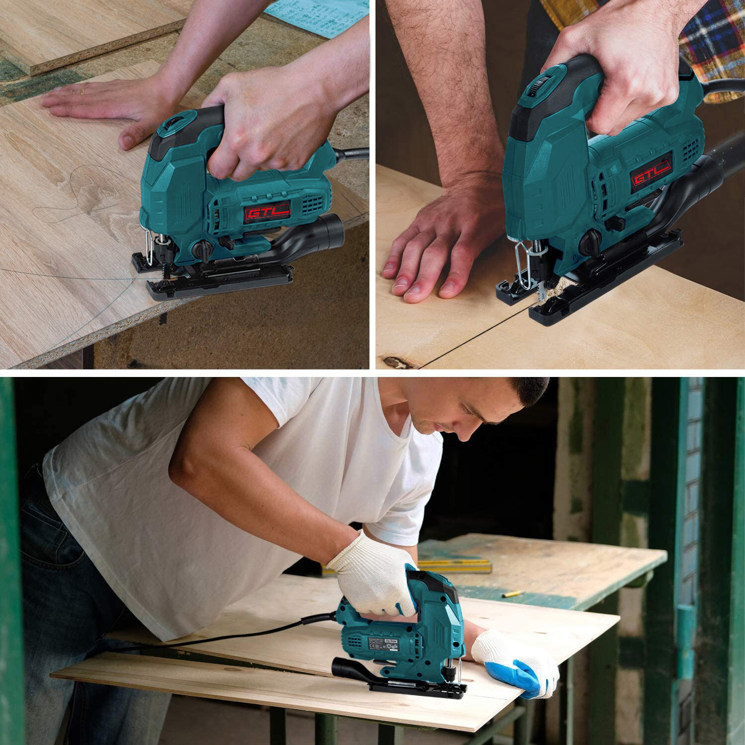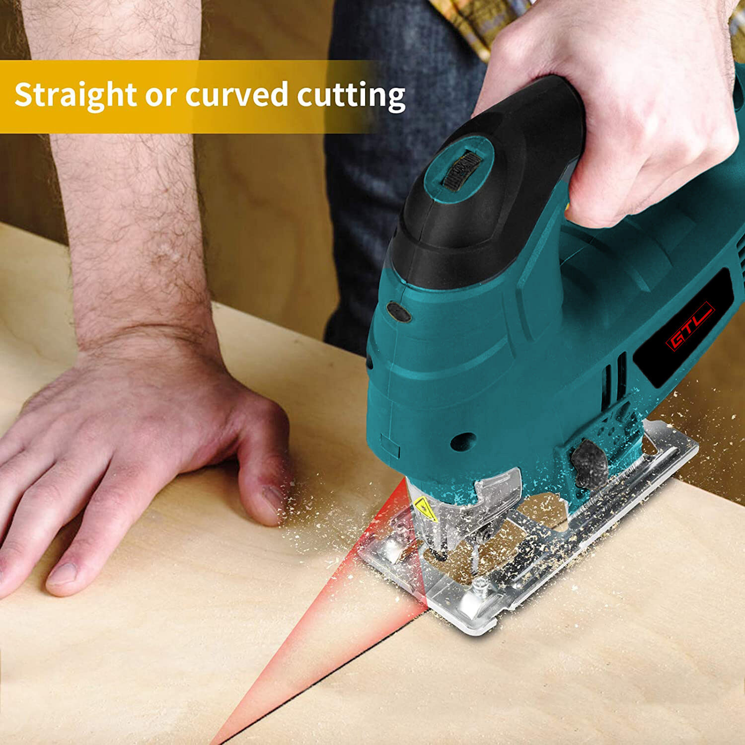 LASER GUIDE AND ANGLE MAX 45°: Equipped with laser guide and scale guide, the electric jigsaw make cutting more precise. Adjusts the right and left angle to 45°, which can be used to do more difficult work.