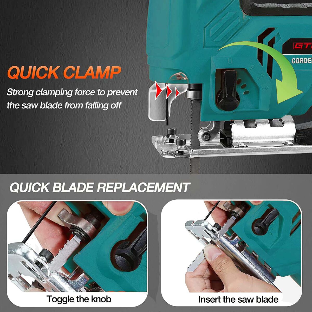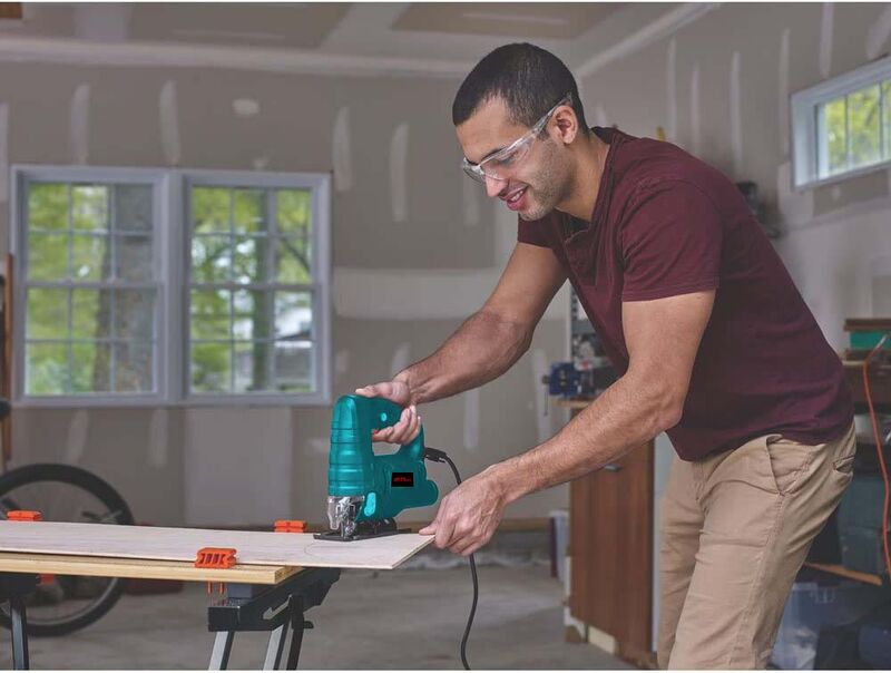 LASER GUIDE & DUST EXTRACTION: Jigsaw Tool built-in Laser Guide with Scale Ruler provides a tiptop precision and make your cutting in line. Connecting the dust blower keeps the line of cut sawdust clean, provide you a clean working environment and clear line of sight.