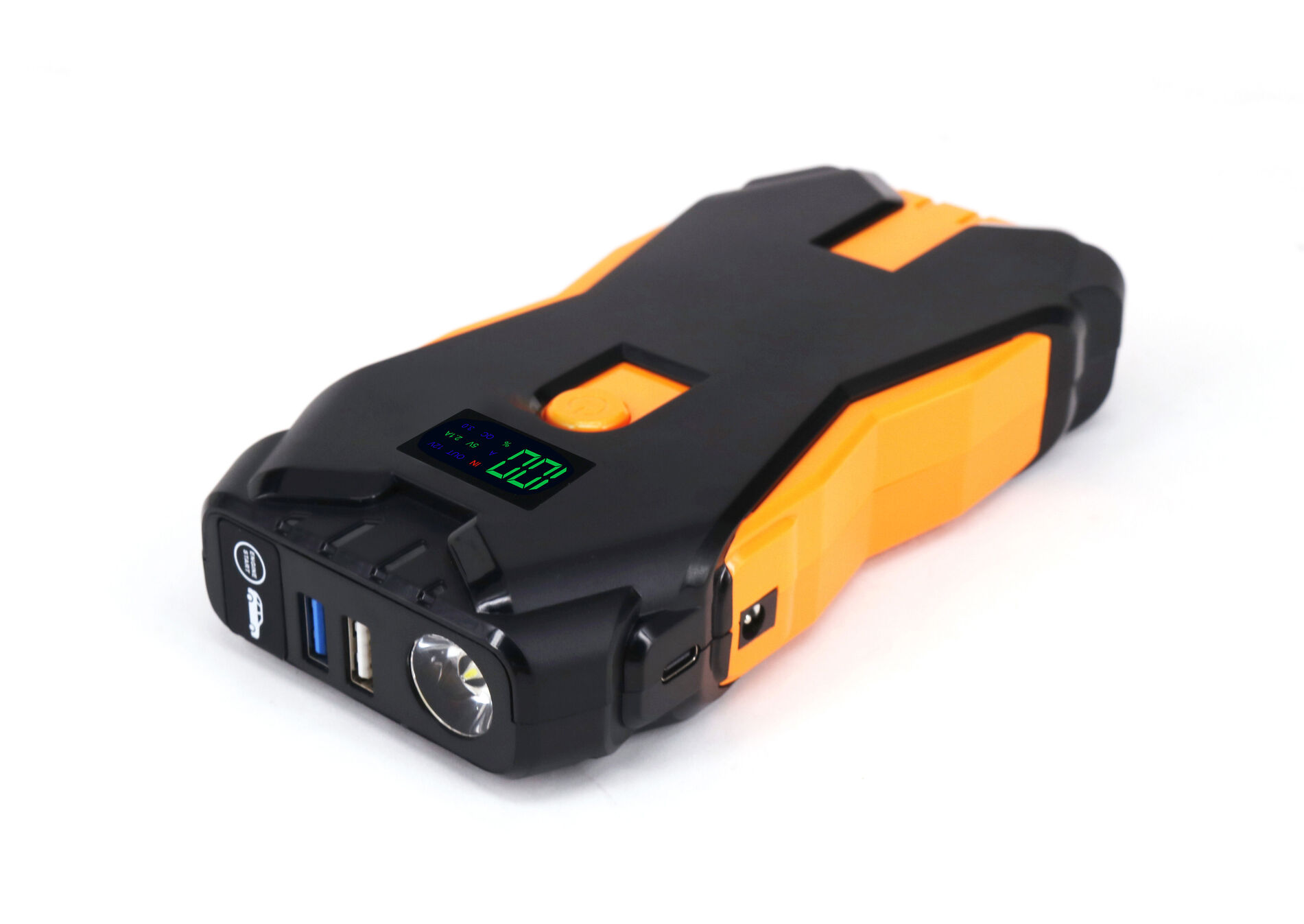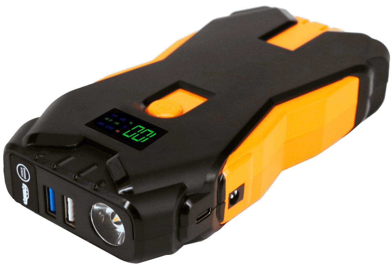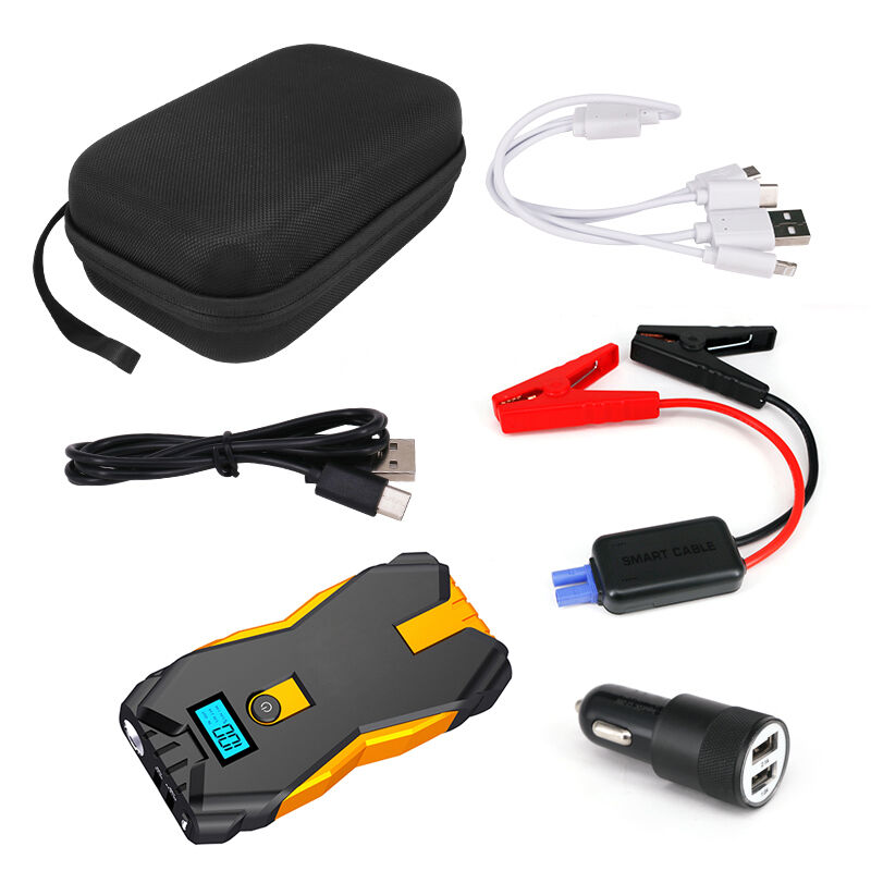 This car jump starter is a multifunctional device designed to provide power to vehicles and personal devices, with added features for safety and convenience.