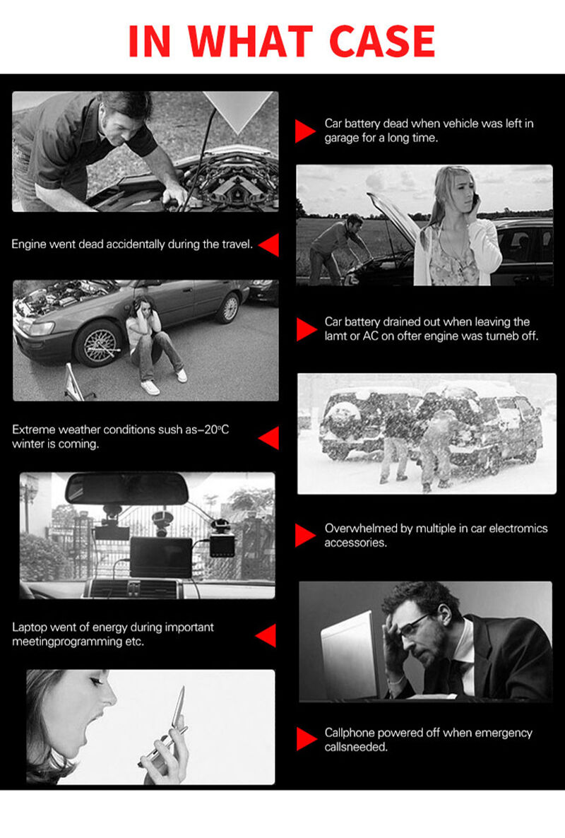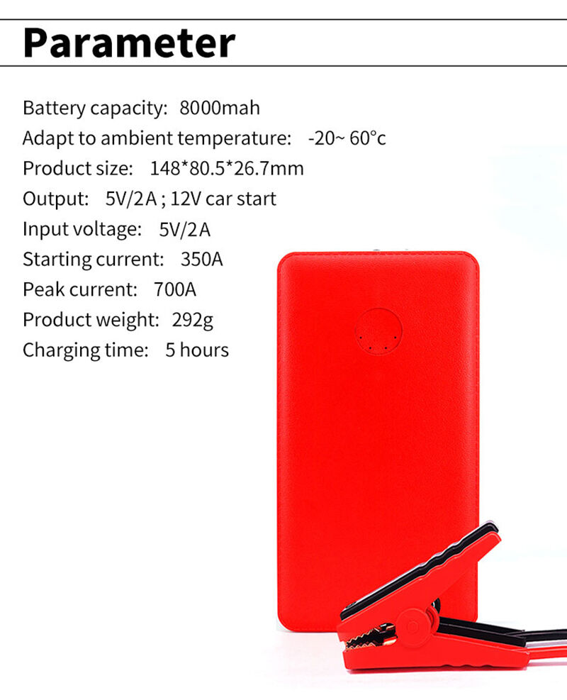 Multiple Function: The multi-function backup battery is suitable for many kinds of cars. 8000mAh portable car battery charger with large battery capacity can not only start the car, equipped with USB interface, but also can charge phones, tablets or other device.