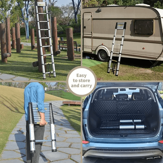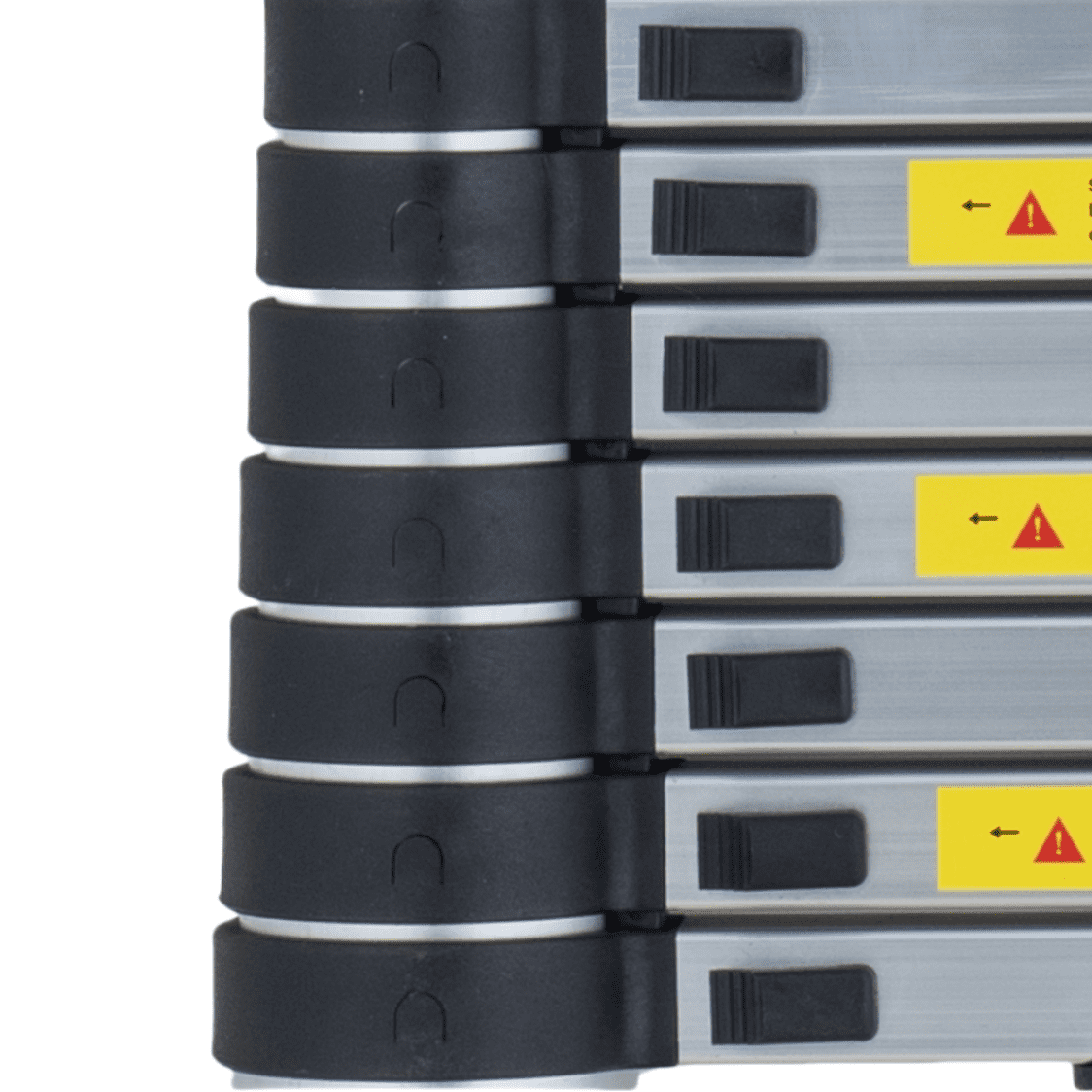 Collapsible Telescopic Ladder Quality: This 3.2m/3.8m/5m aluminum extension ladder is crafted from high-quality aluminum alloy, with plastic components reinforced by nylon fiber for improved strength, stability, aging resistance, and longevity.