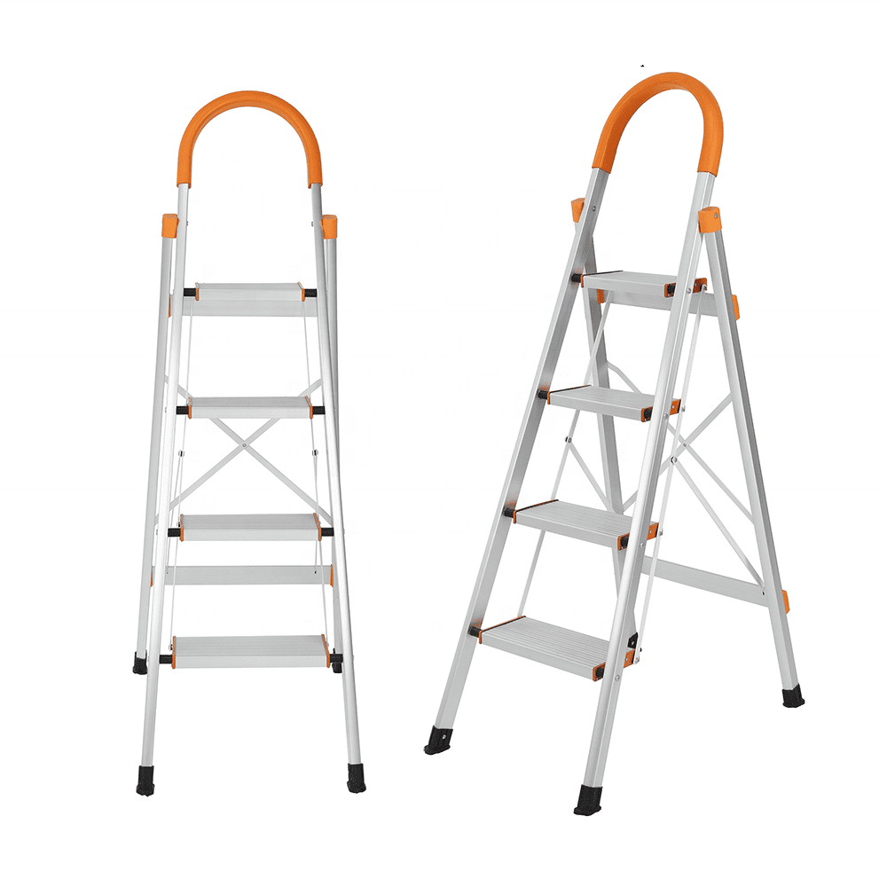 This foldable 4-step ladder is perfect for kitchen, office, bathroom and garage tasks like reaching high cabinets or changing light bulbs. Made of heavy-duty aluminum alloy, it holds 330 lbs yet is lightweight. With non-slip rubber pads on legs for safety, it's fully assembled, easy to fold, store and transport. A durable choice for home or shop.
