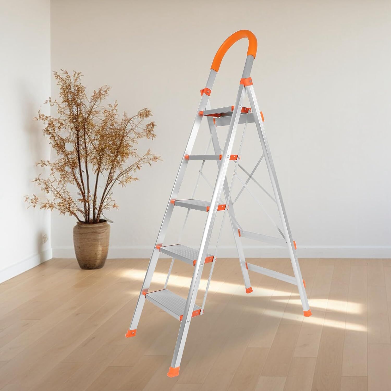 This foldable 5-step ladder is perfect for kitchen, office, bathroom and garage tasks like reaching high cabinets or changing light bulbs. Made of heavy-duty aluminum alloy, it holds 330 lbs yet is lightweight. With non-slip rubber pads on legs for safety, it's fully assembled, easy to fold, store and transport. A durable choice for home or shop.