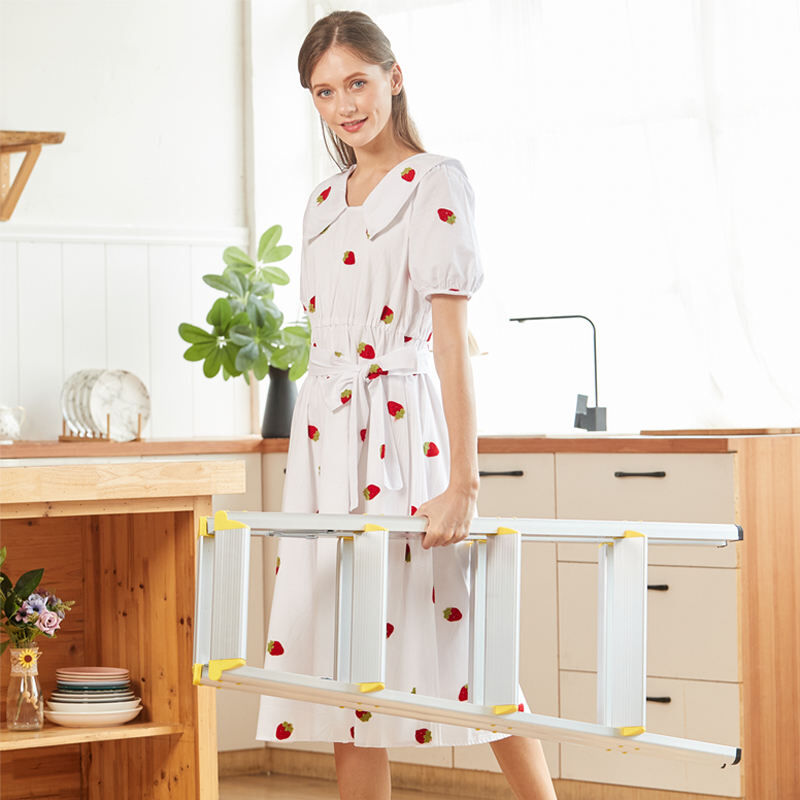 This ladder features a rectangular non-slip mat with deep grains and mute foot grips for secure, quiet use. Reinforcement strips and a flexible articulated buckle ensure stability and durability. Crafted from corrosion-resistant aluminum alloy with an anodic curing finish, it's lightweight yet sturdy. Eco-friendly, family-safe materials, plus a sleek design, make it easy to store and ideal for various indoor cleaning tasks.
