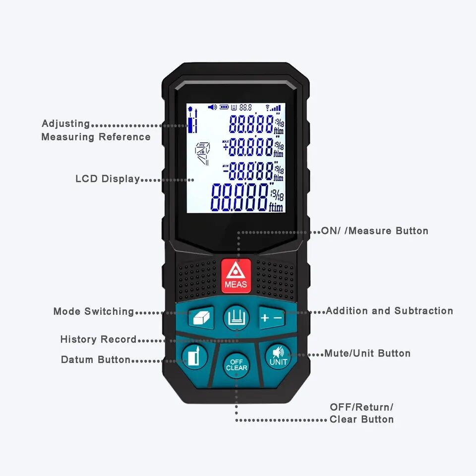 Advanced laser measuring device with laser precision technology, it will real-time display the data when measuring; The measuring range of digital measuring tape is from 0.05m to 60m, very accurate and efficient.Units can be easily changed between M/In/Ft with an accuracy of ±2mm .