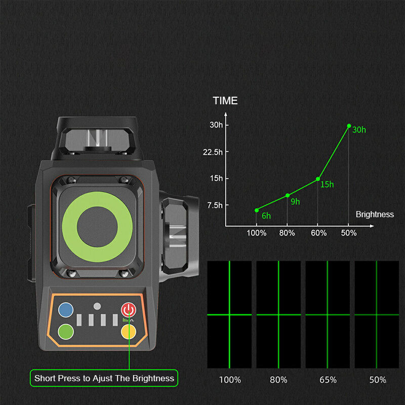 Rechargeable Laser Level:This laser level green is powered by a Built-in 3.7V Li-ion Battery. The high-capacity battery allows the laser level to work for 6 hours. The Type-C USB charging cable provides fast charging speed.